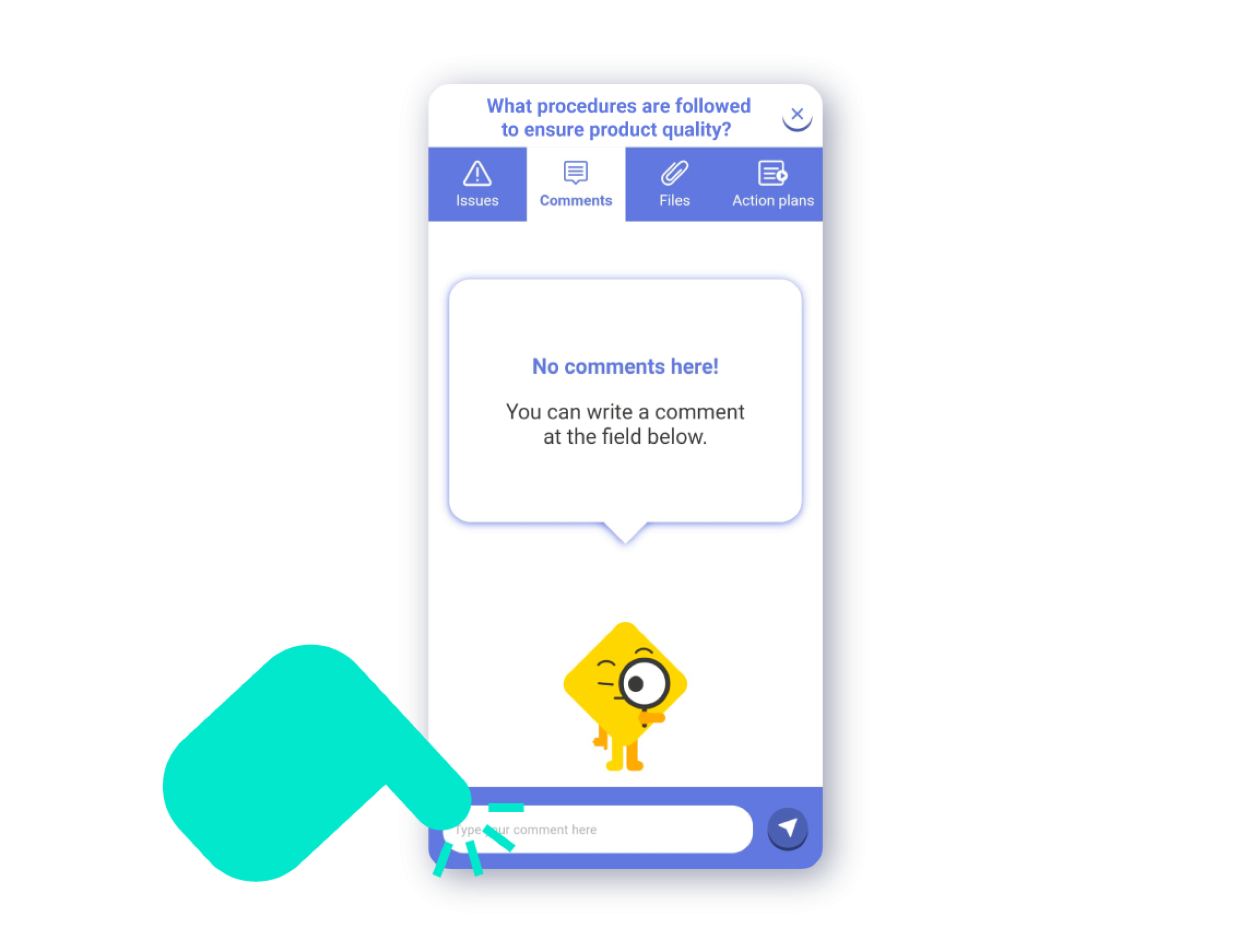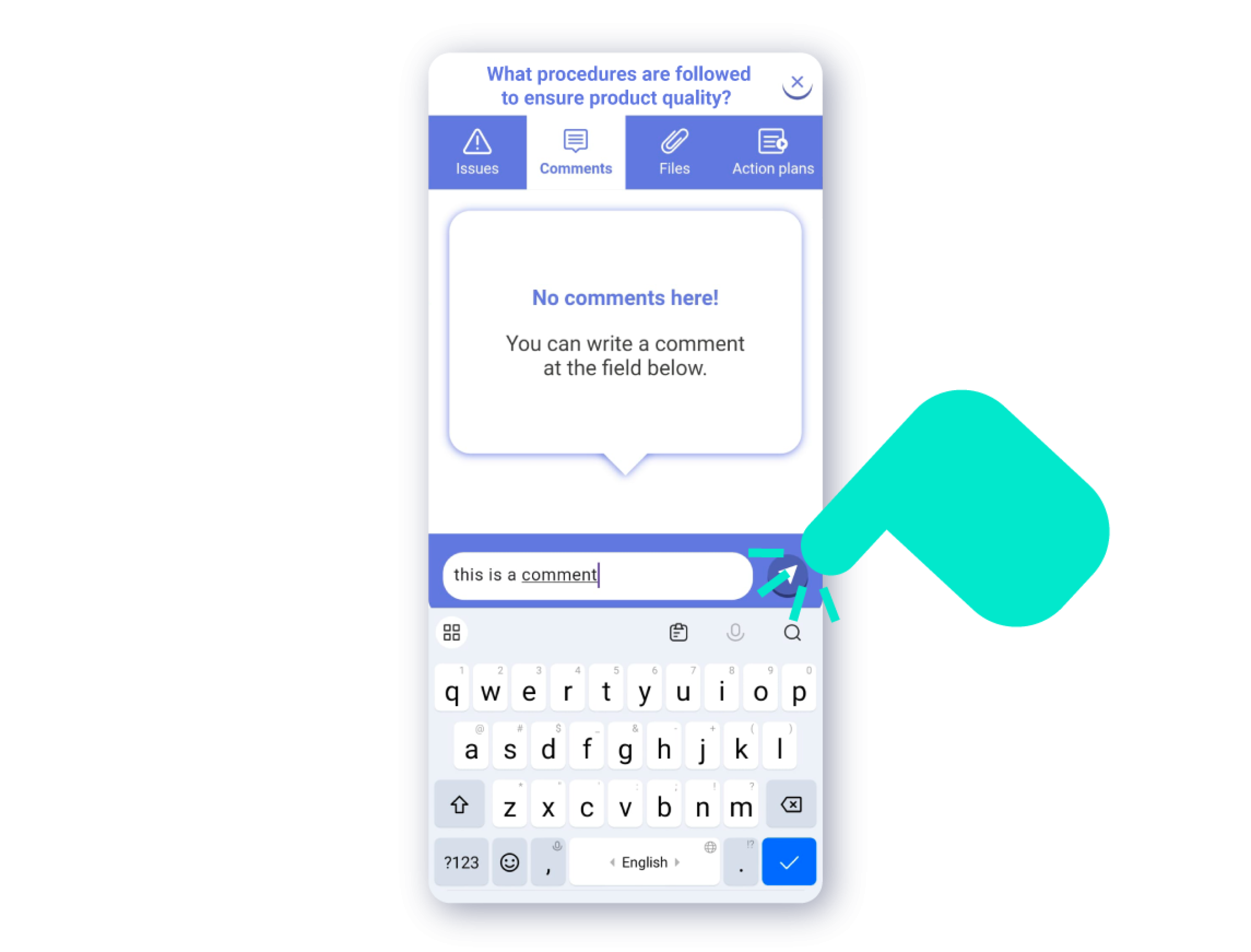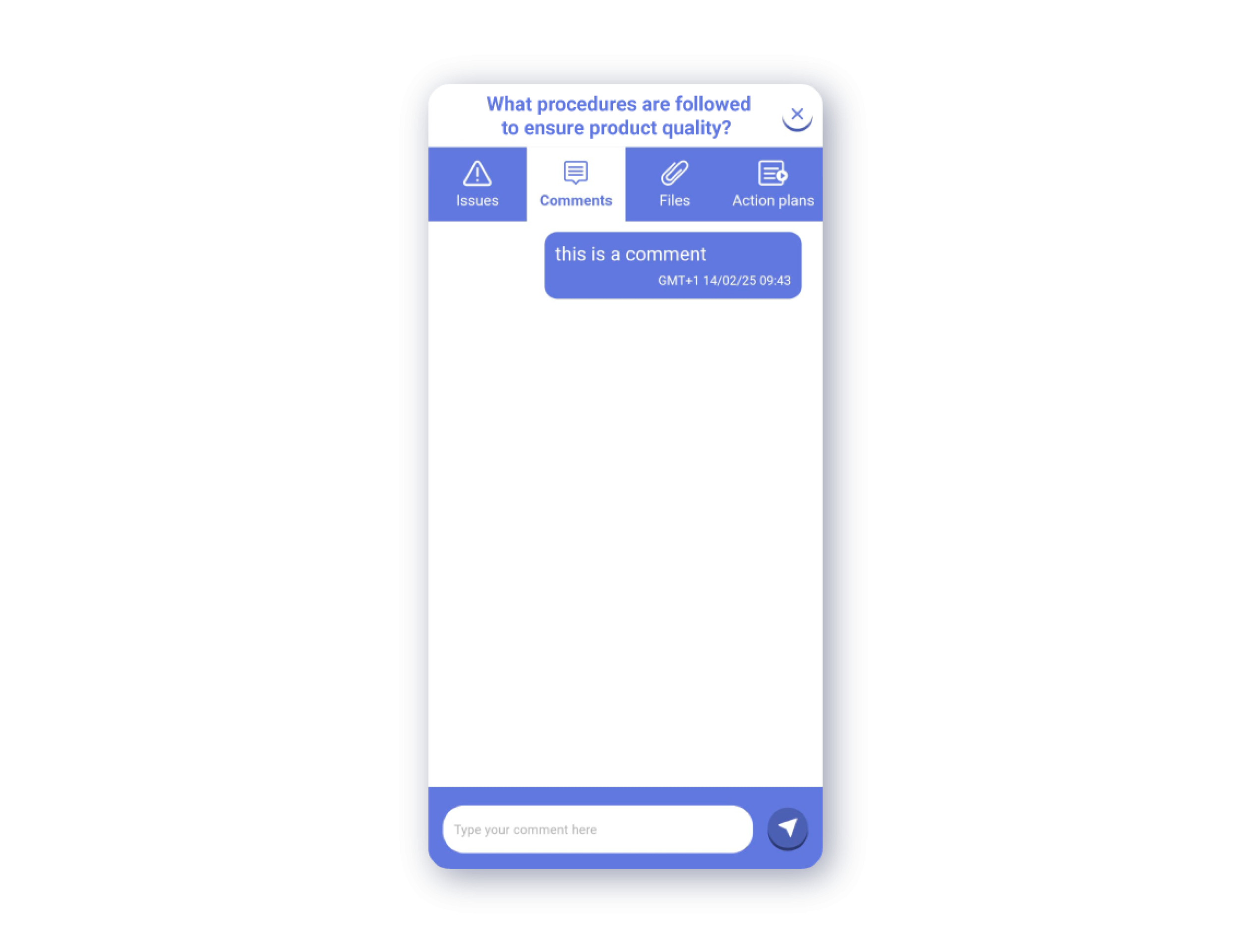 Add Comment: By tapping the ‘Comment’ icon, an internal chat for the question will open, where you can register the comment. To write the comment, tap on the comment bar at the bottom of the screen. Once you have written the comment, press the send button right next to the comment bar.