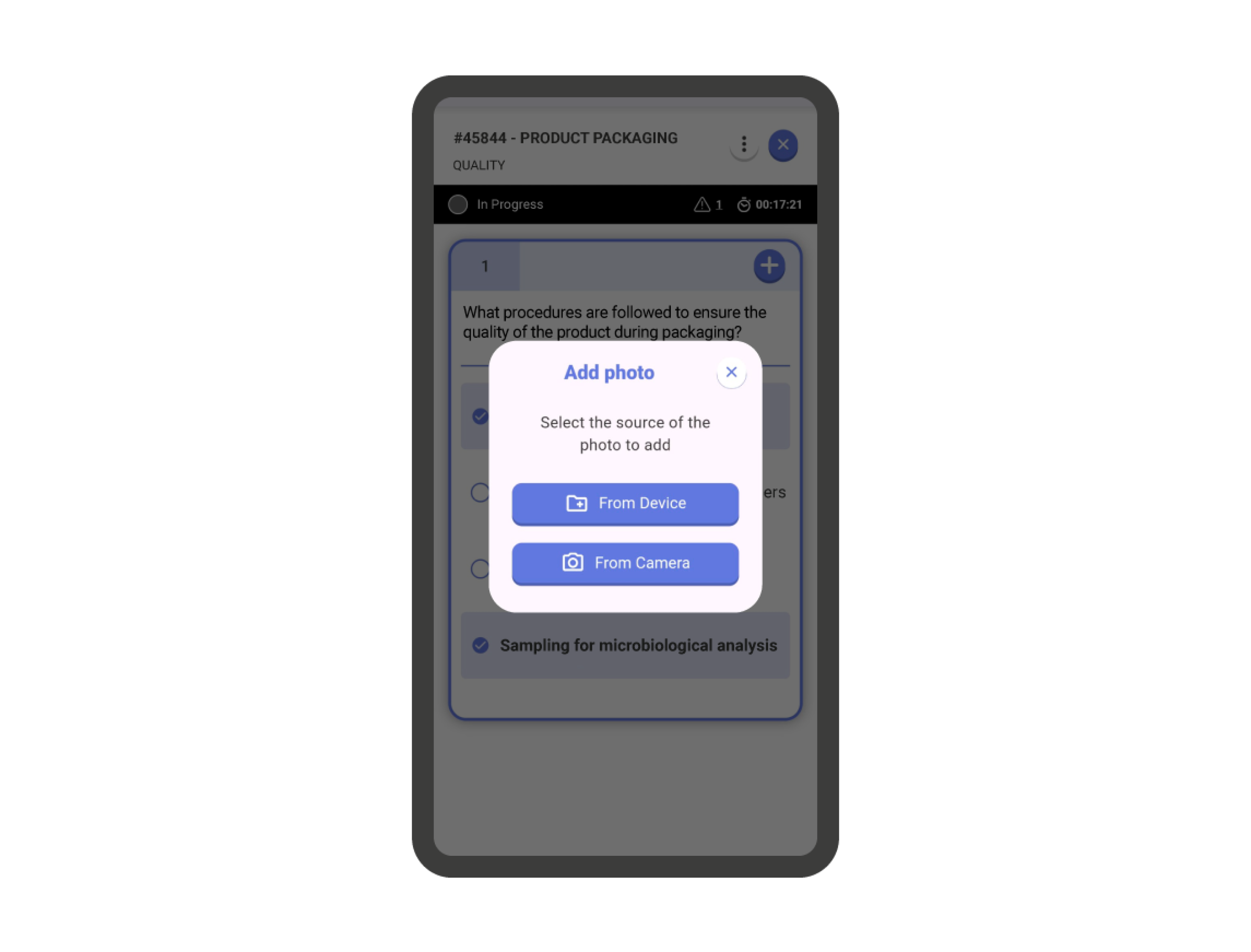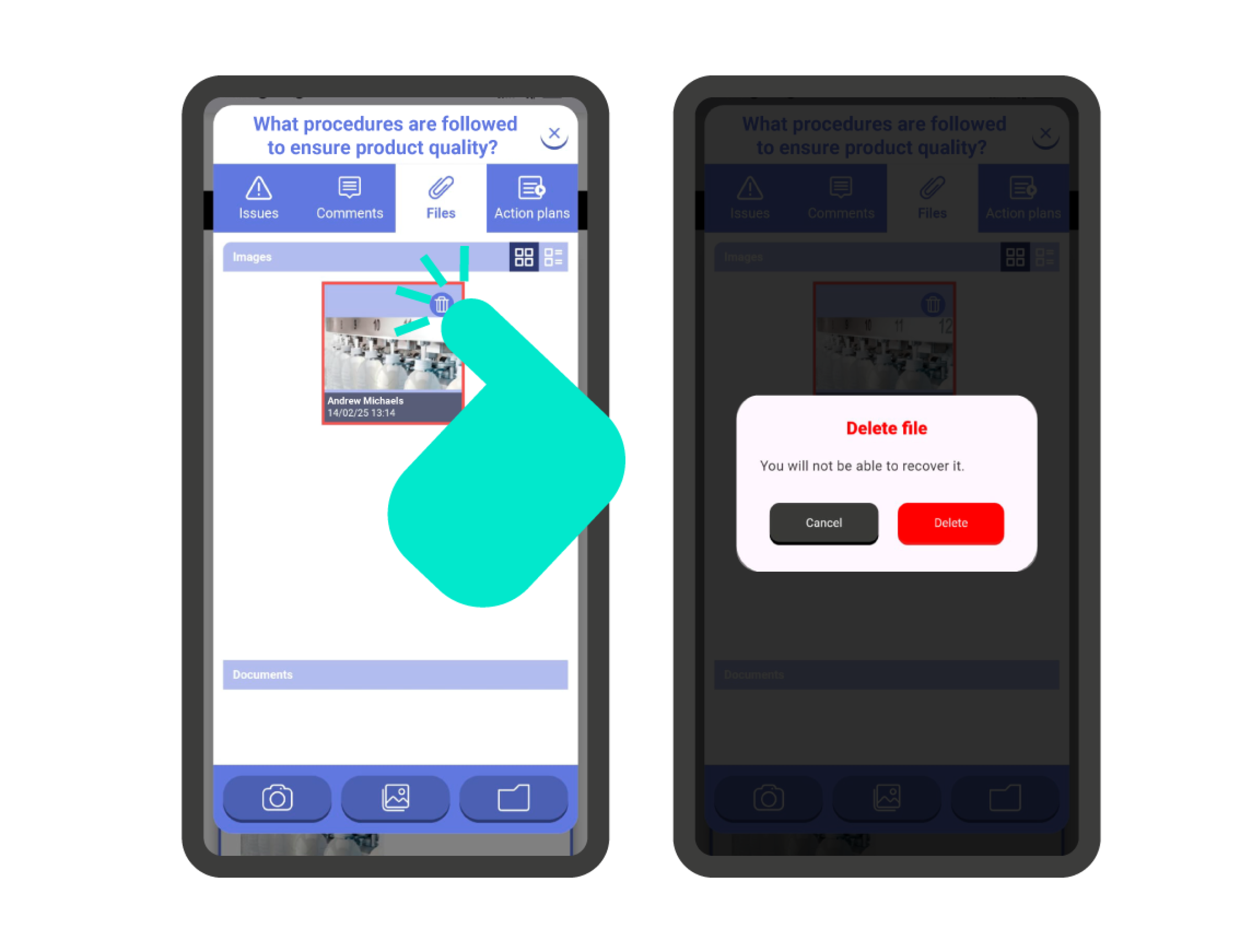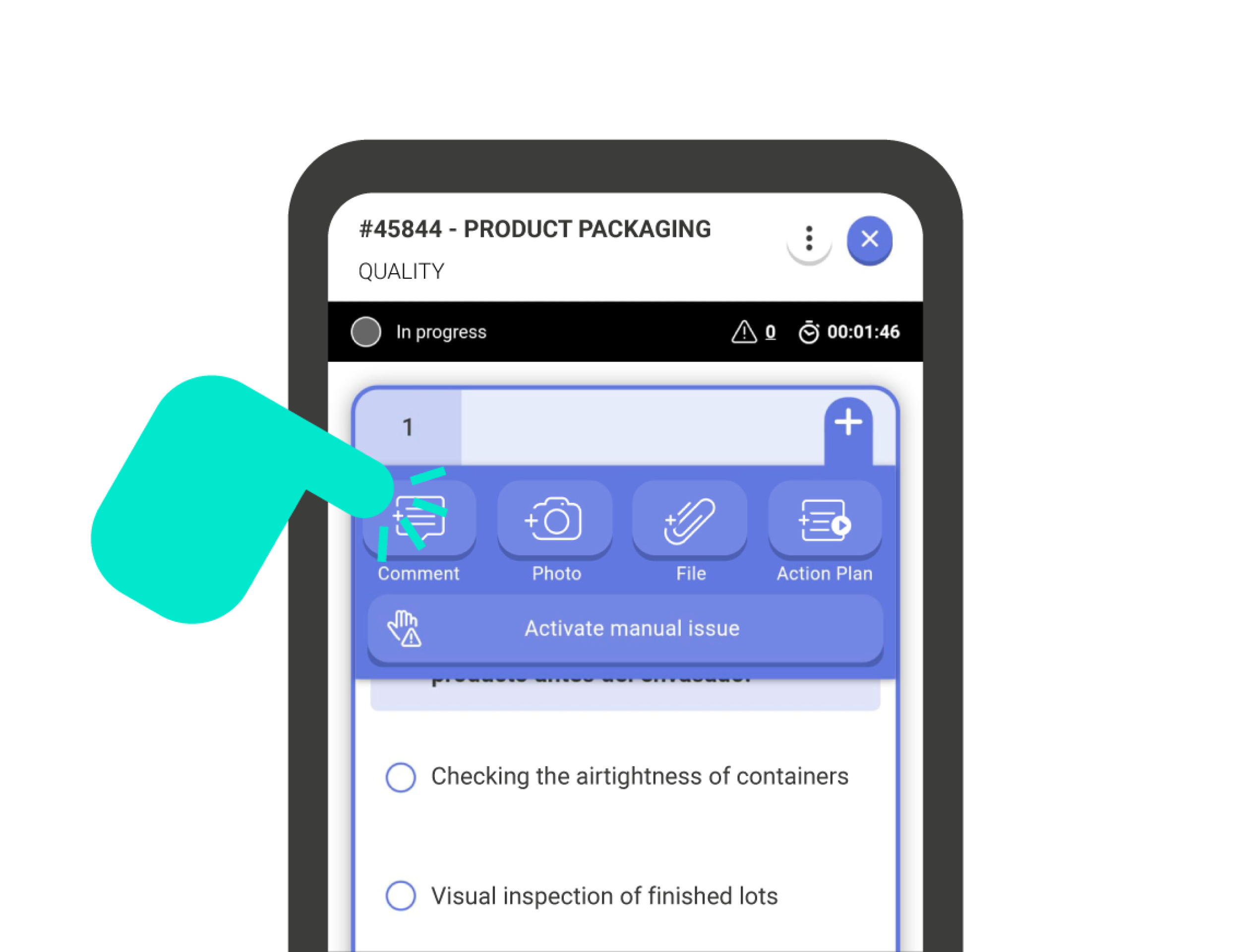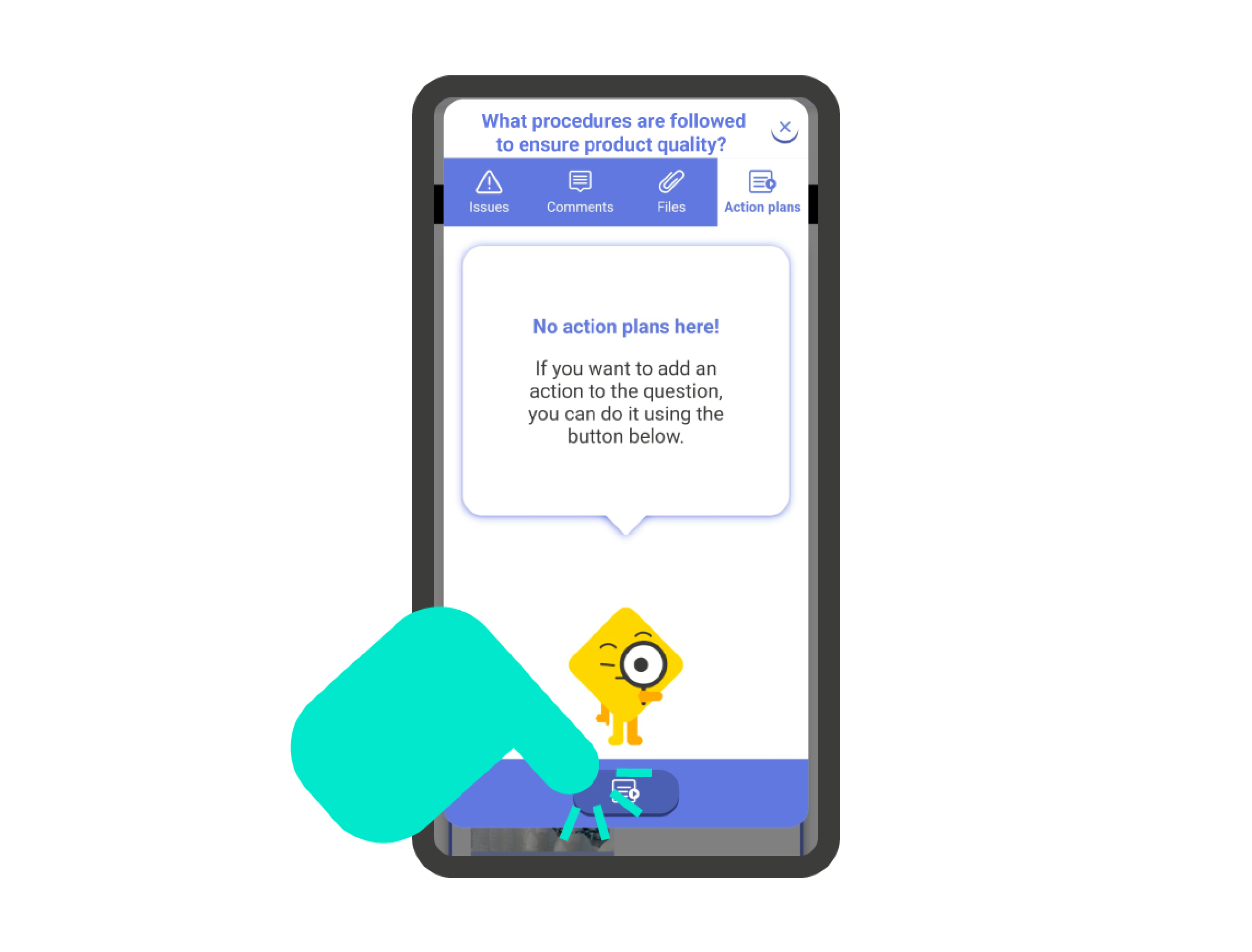 Add Comment: By tapping the ‘Comment’ icon, an internal chat for the question will open, where you can register the comment. To write the comment, tap on the comment bar at the bottom of the screen. Once you have written the comment, press the send button right next to the comment bar.