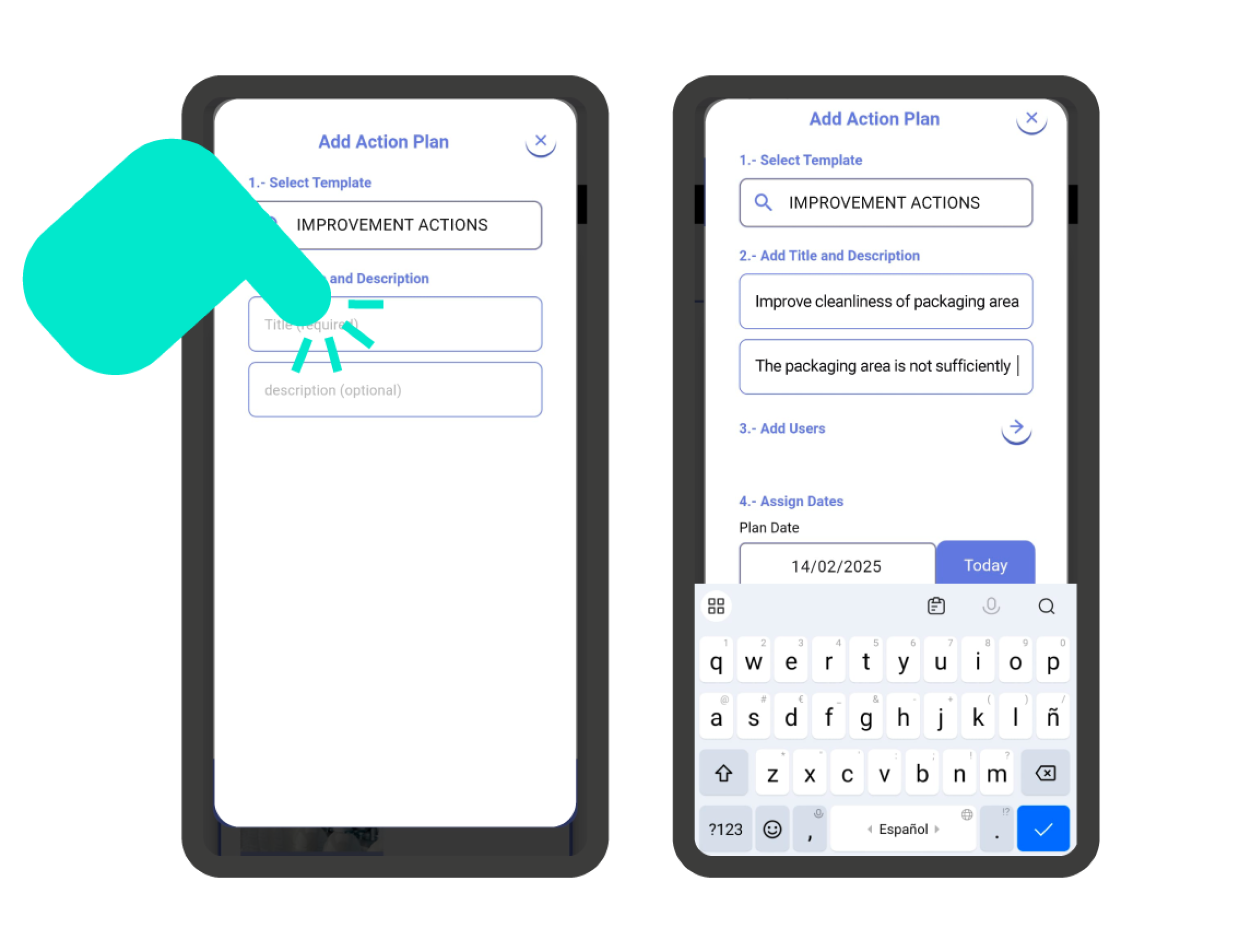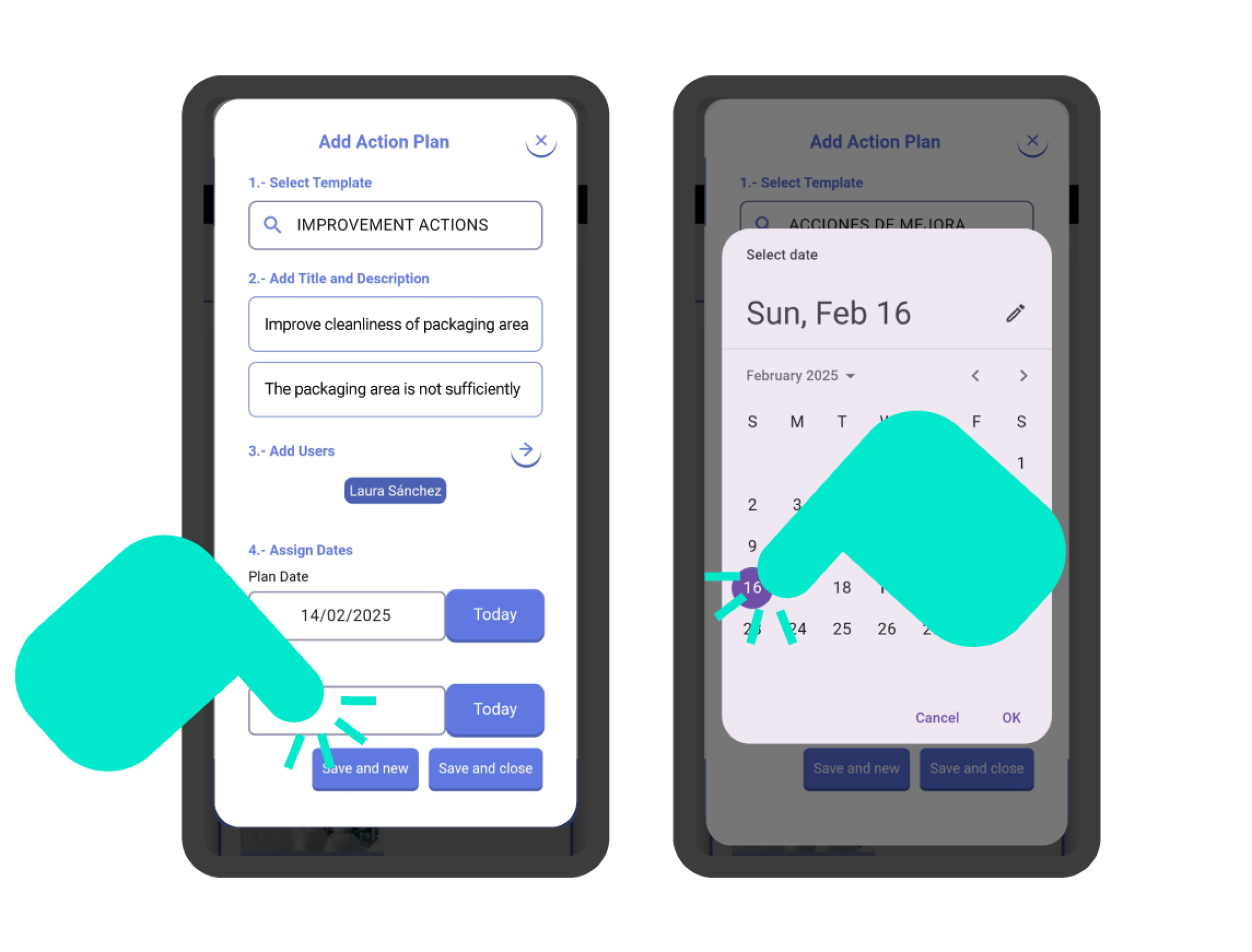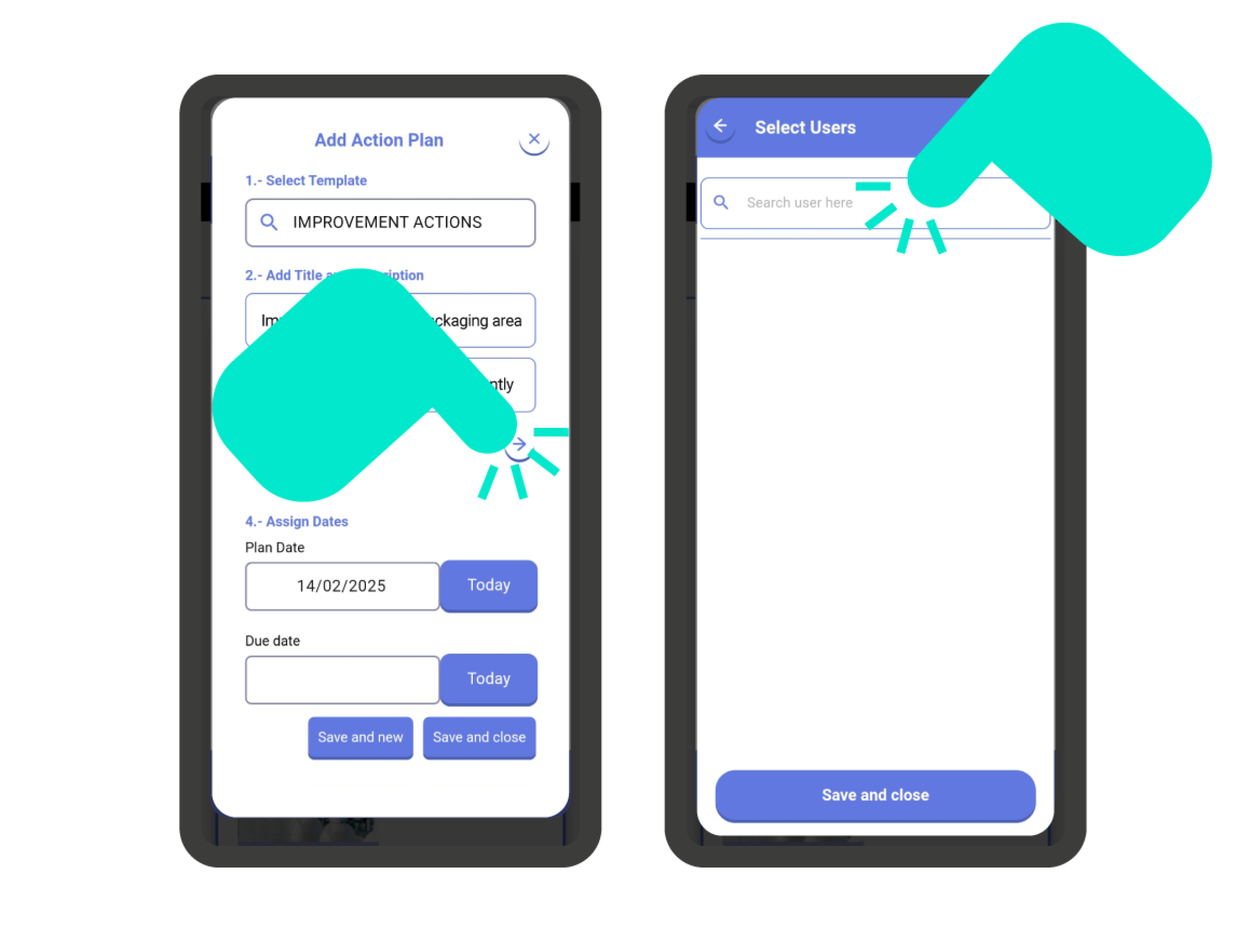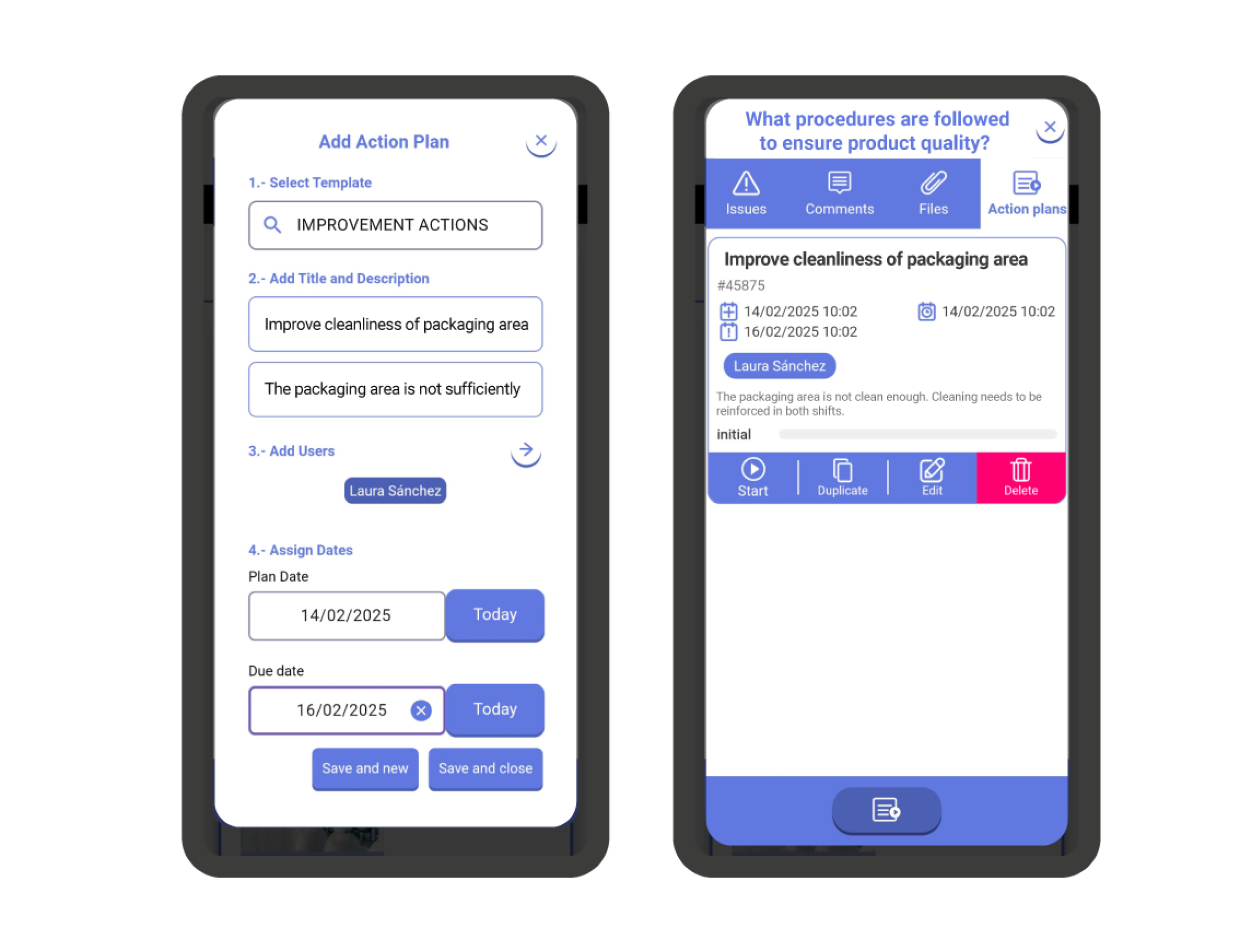 Defining an action plan is very straightforward. The first thing you need to do is select an action plan template. Then, add a name and description (instructions to follow, objectives to achieve, problem to solve…) to the action plan. Finally, optionally, assign one or more users and define the planning and expiration date.