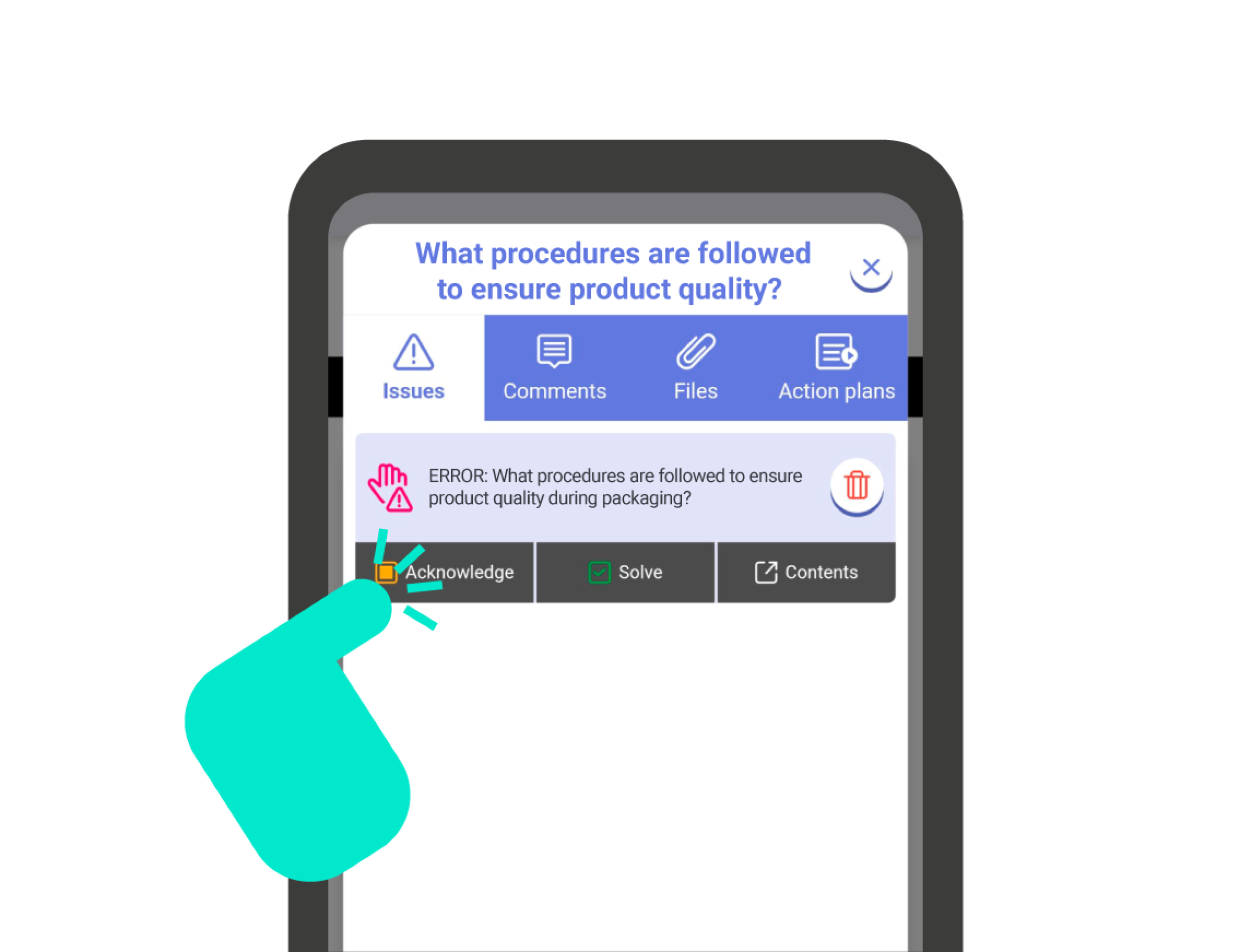 When an issue appears after answering a question, or you manually mark an issue within a question, you should know that you can move that issue through different statuses to indicate its progress.