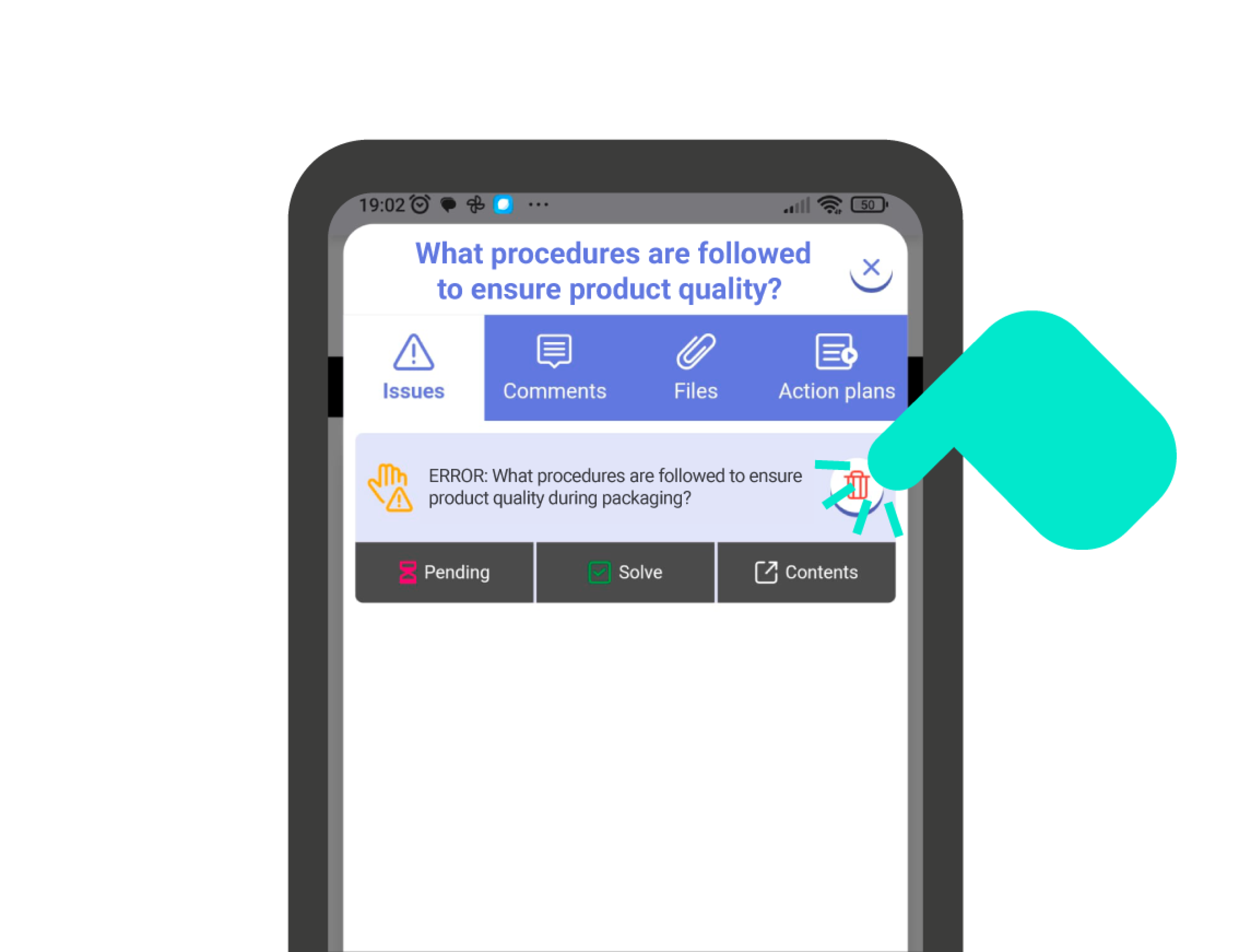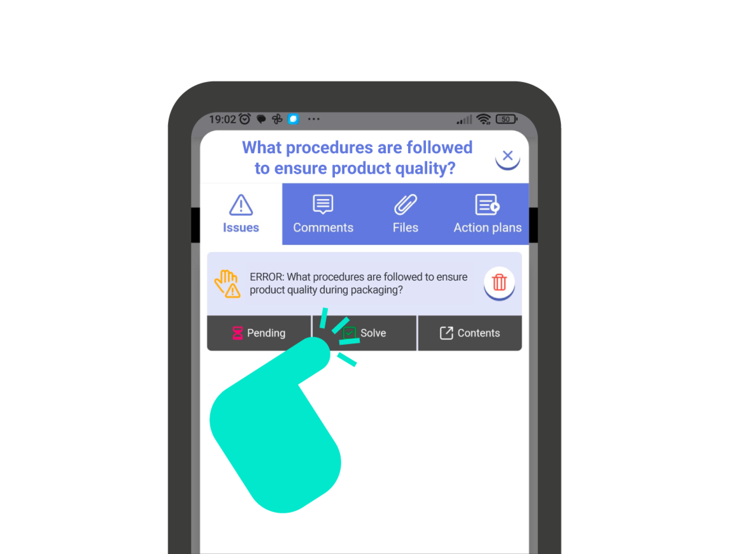 To change the status of the issue, click on the icon with the triangle and exclamation mark that appears at the top of the card. This will open the ‘issues‘ panel of the question, where you’ll find all the issues that question might have. Now you can click on the different available statuses in the lower bar of the issue.