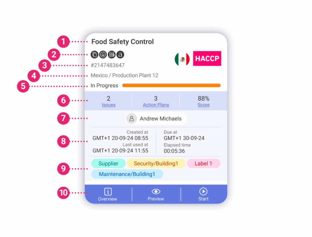 On the checklist card, you can find a wealth of information about the checklist. All the information you see on the card is fully configurable so that you can generate the card view that best suits your specific needs.