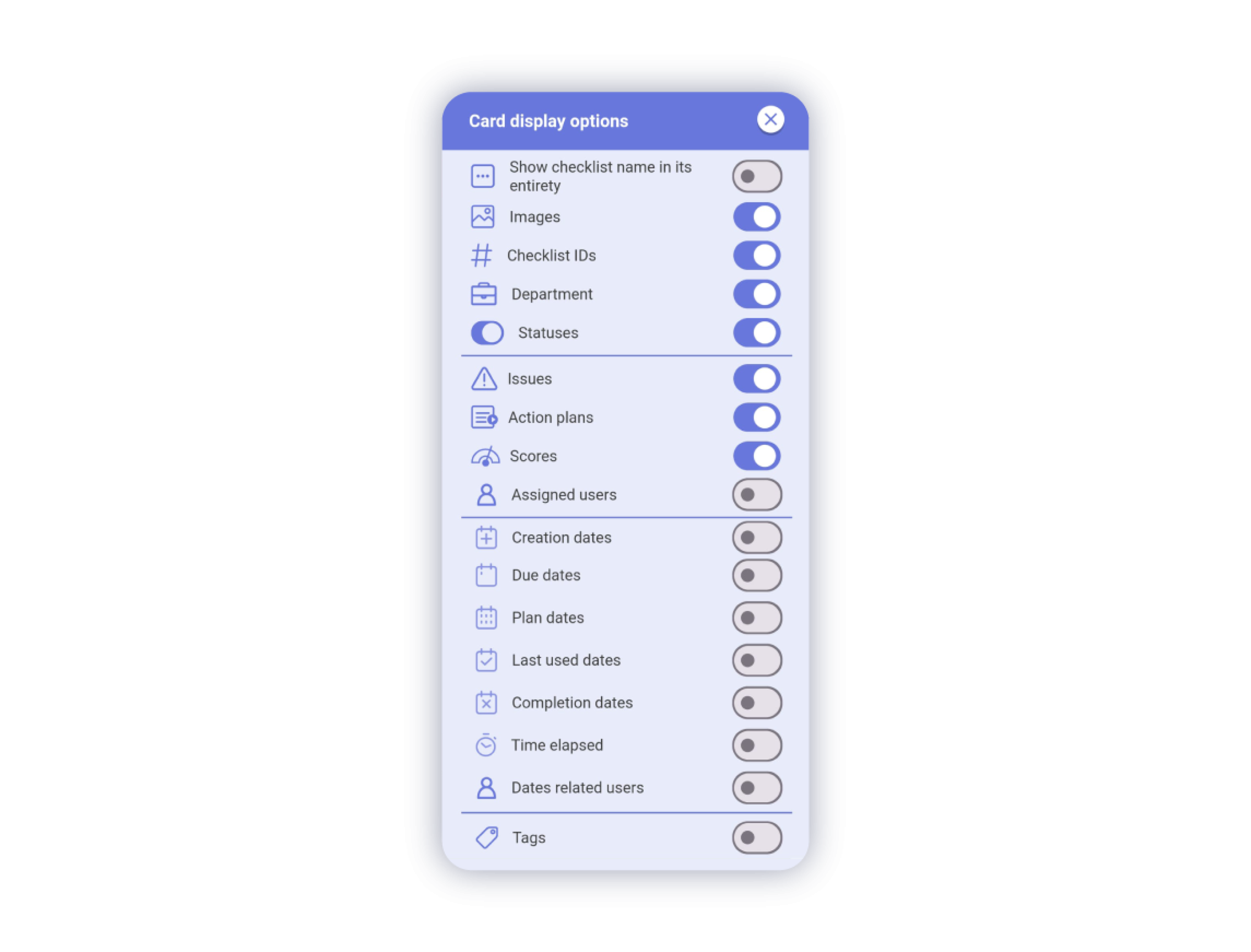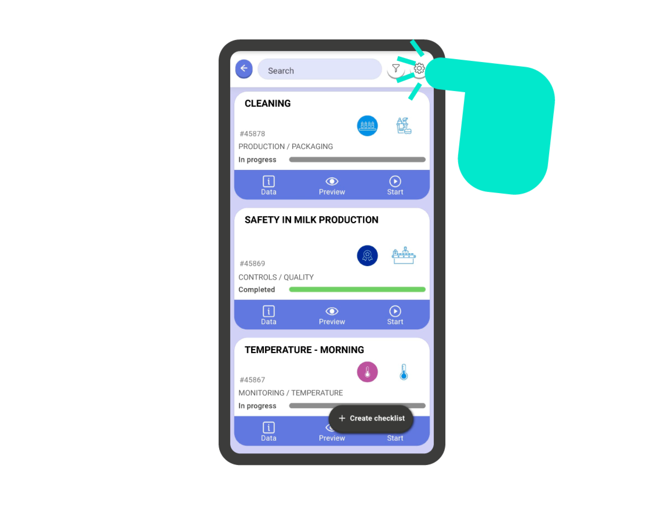 All the information displayed on the front of the checklist cards is fully configurable. To access the configuration panel, click on the gear icon on the checklist listing screen.