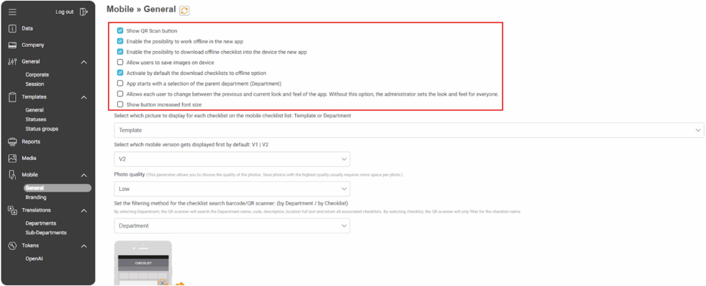 A new Mobile section has been added to the settings menu. Under Mobile > General, you will find key configurations that affect how the mobile application works for all users.