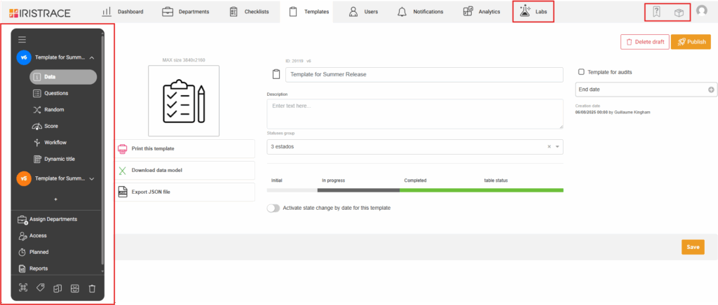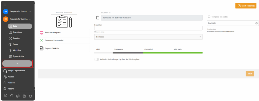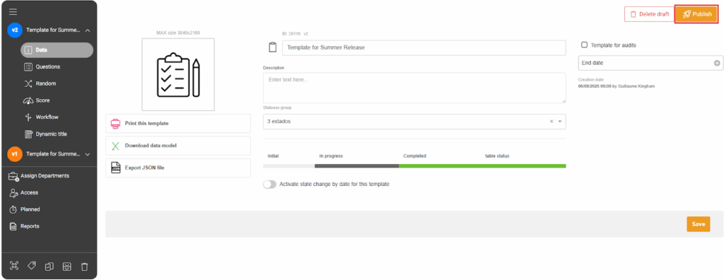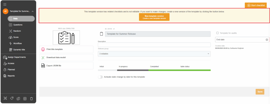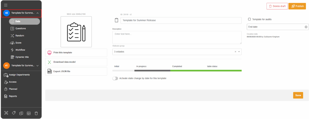 Template versioning allows you to make changes to a template without affecting the checklists already created. This is managed through two states: a Draft and a Published version.
