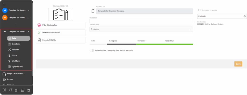 - Draft (Blue): This is your working version. When you create a new template or a new version of an existing one, it will be in draft mode. All changes you make to the Data, Questions, Random, Score, Workflow, and Dynamic Title sections are saved here. Draft versions are indicated by a blue icon next to the version name.