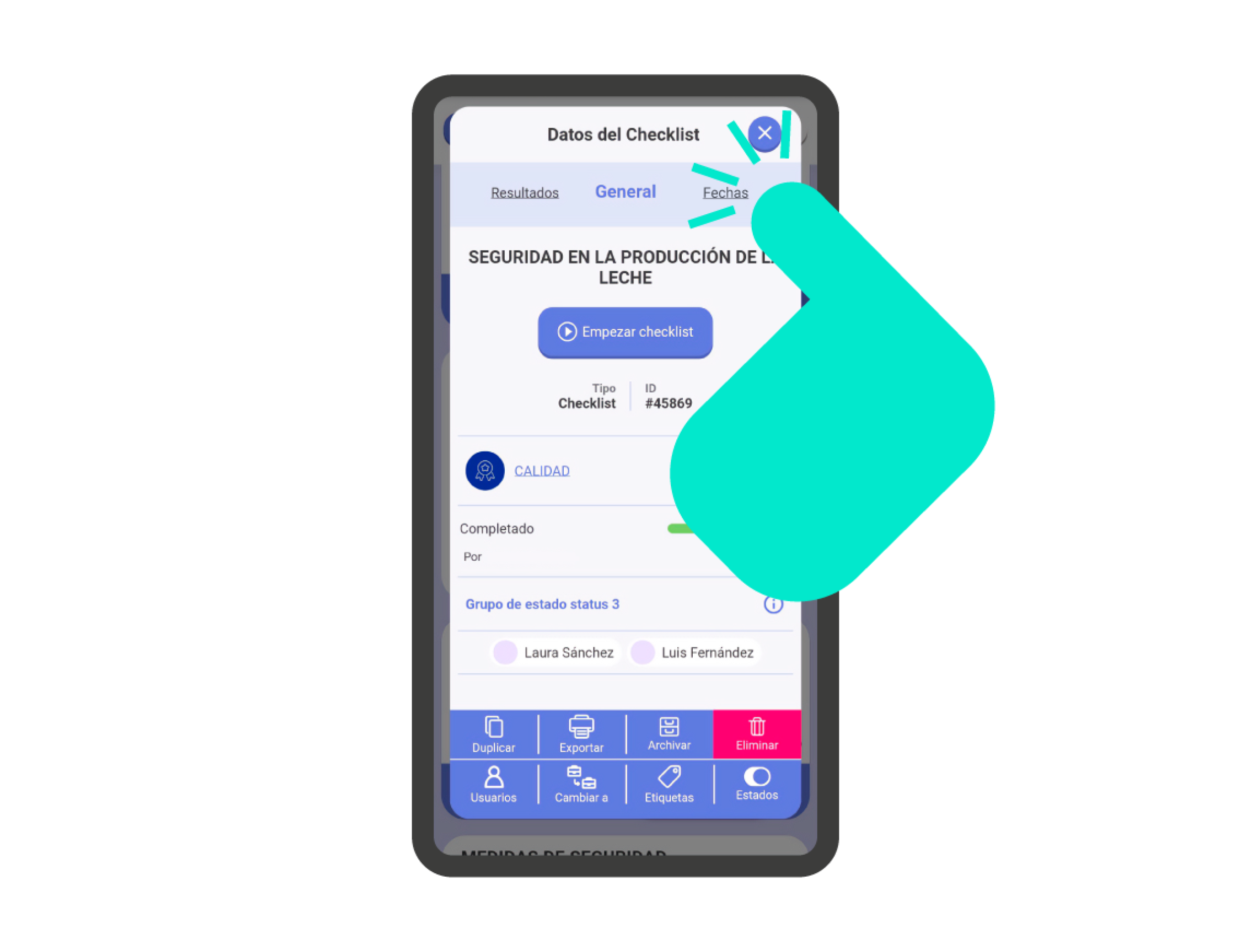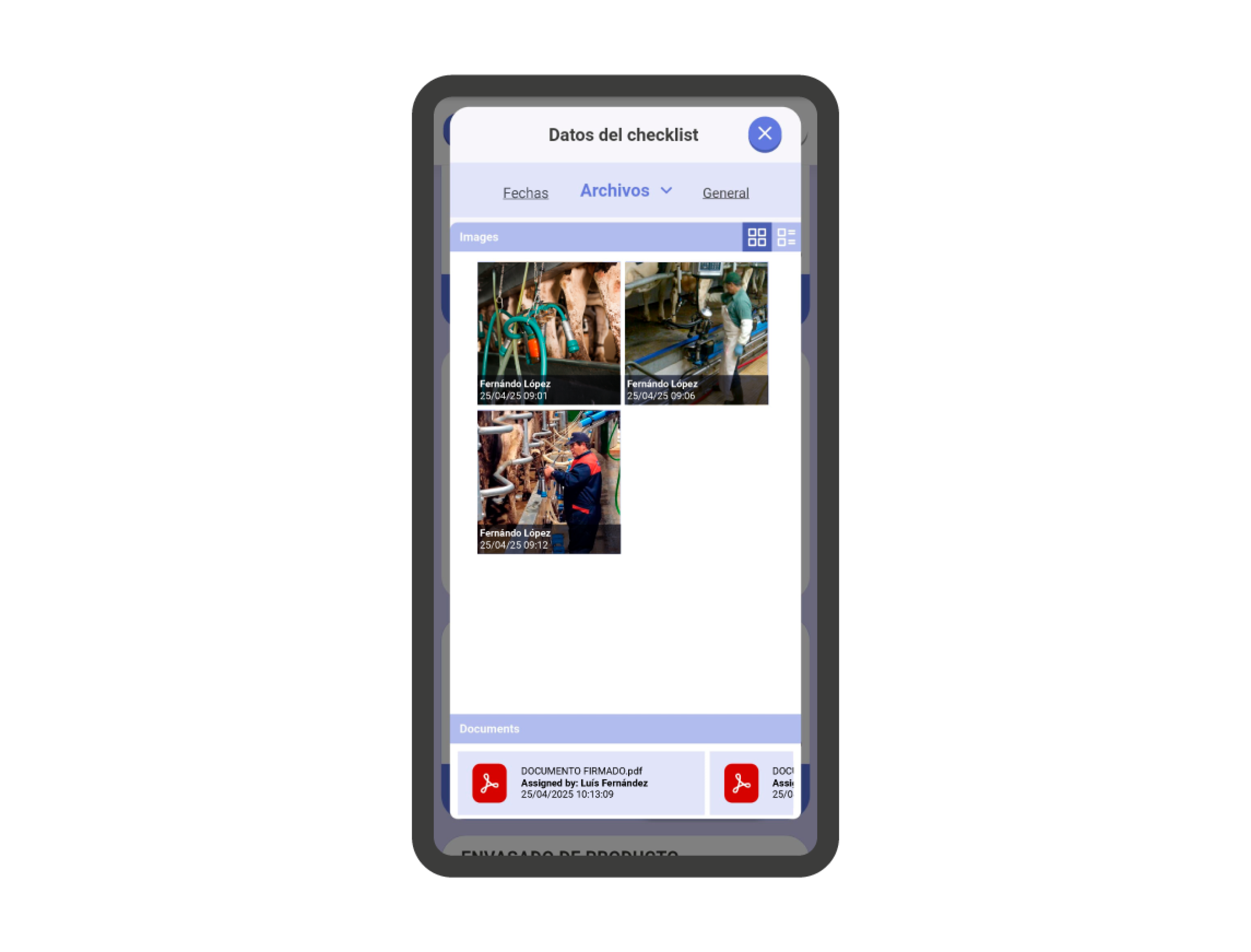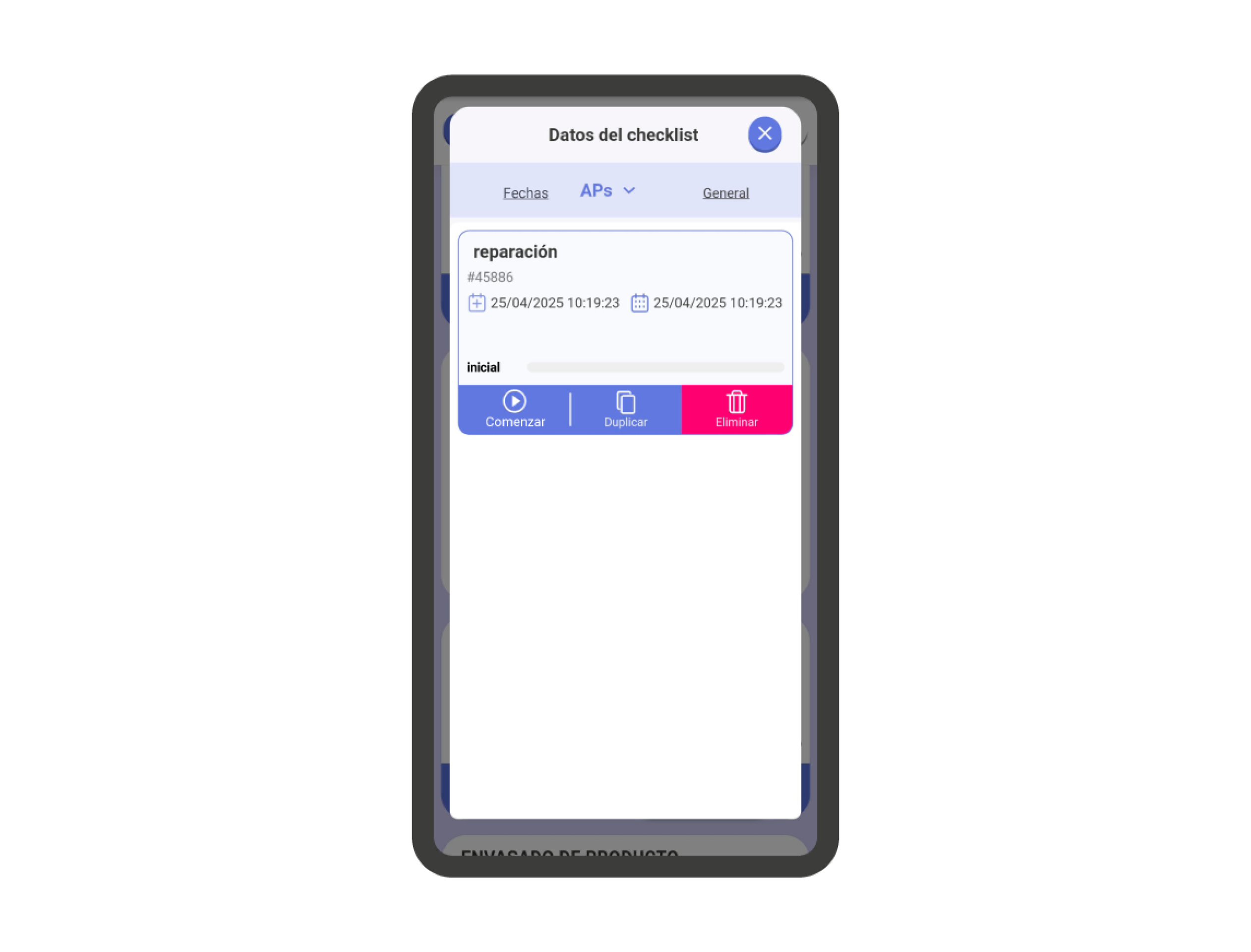 - Planificado para el: Muestra la fecha de planificación de la checklist, y el usuario involucrado.