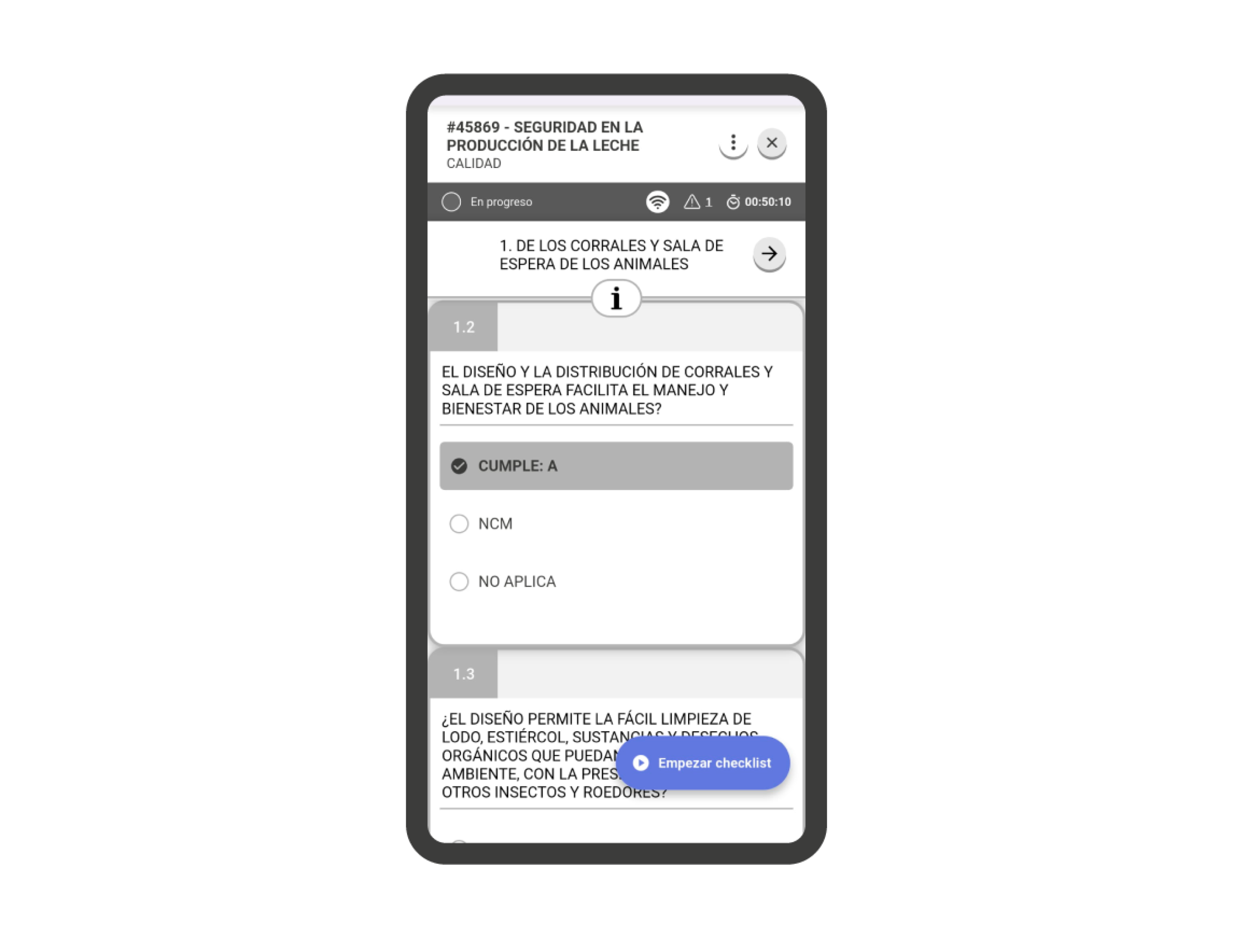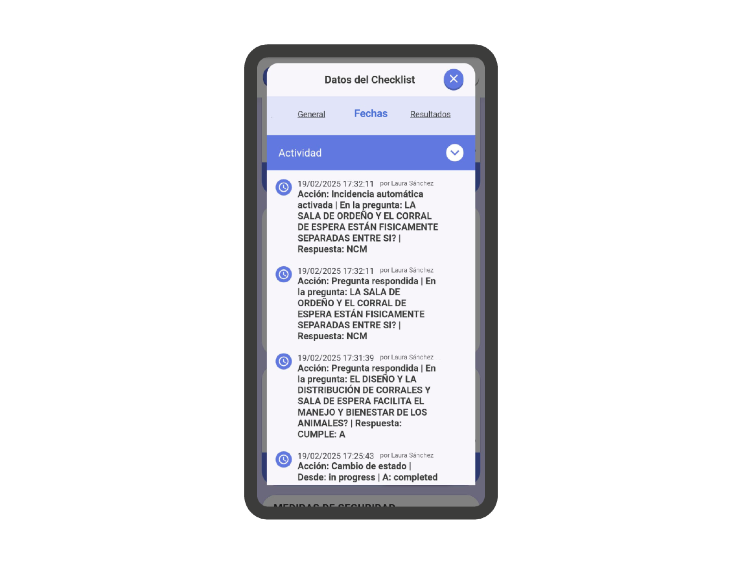 - Tiempo transcurrido: Muestra el total de tiempo transcurrido desde que se comenzó la checklist, hasta el último acceso registrado.