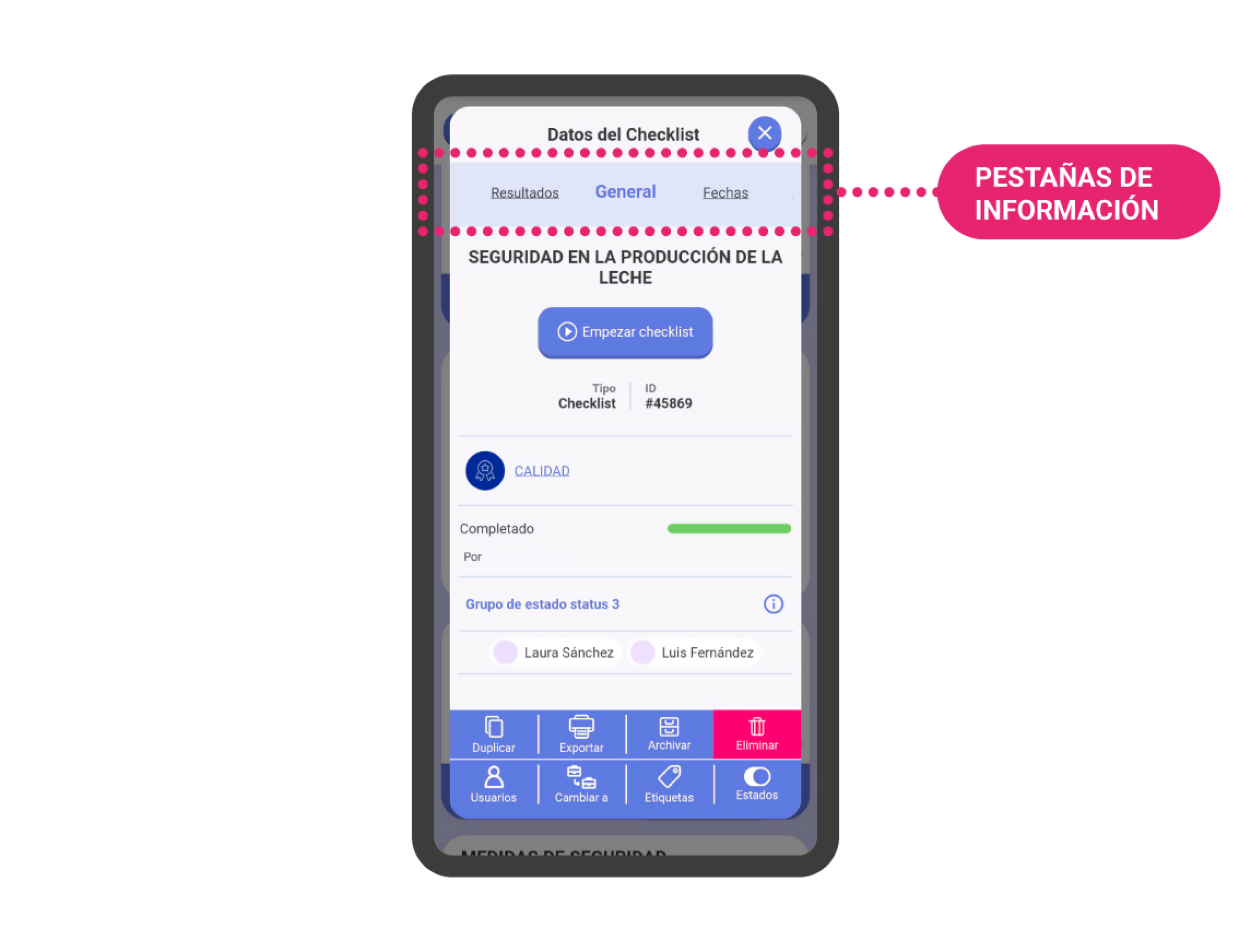 - Creado el: Muestra la fecha de creación de la checklist, y el usuario involucrado.