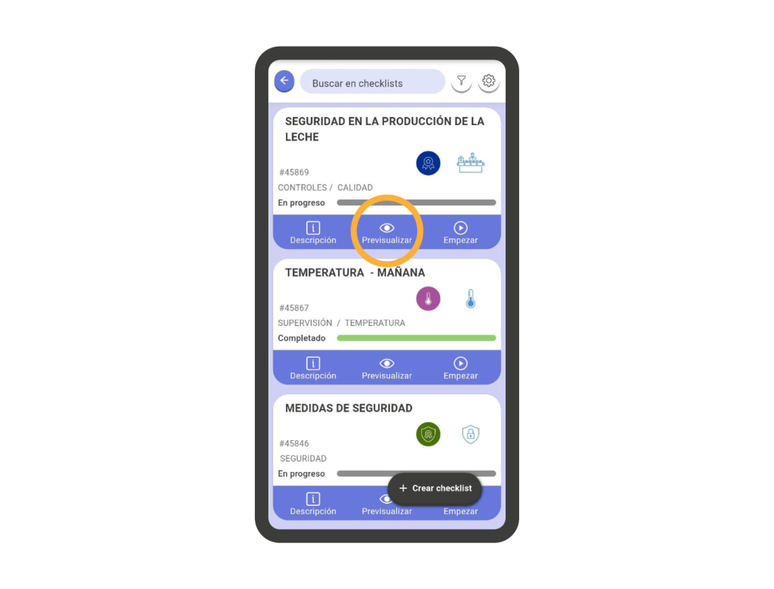 Para acceder al modo de previsualización de una checklist, debemos dirigirnos a la lista de checklists, y pulsar sobre el icono ‘Previsualizar’ en la parte inferior de cada una de las tarjetas de checklist.