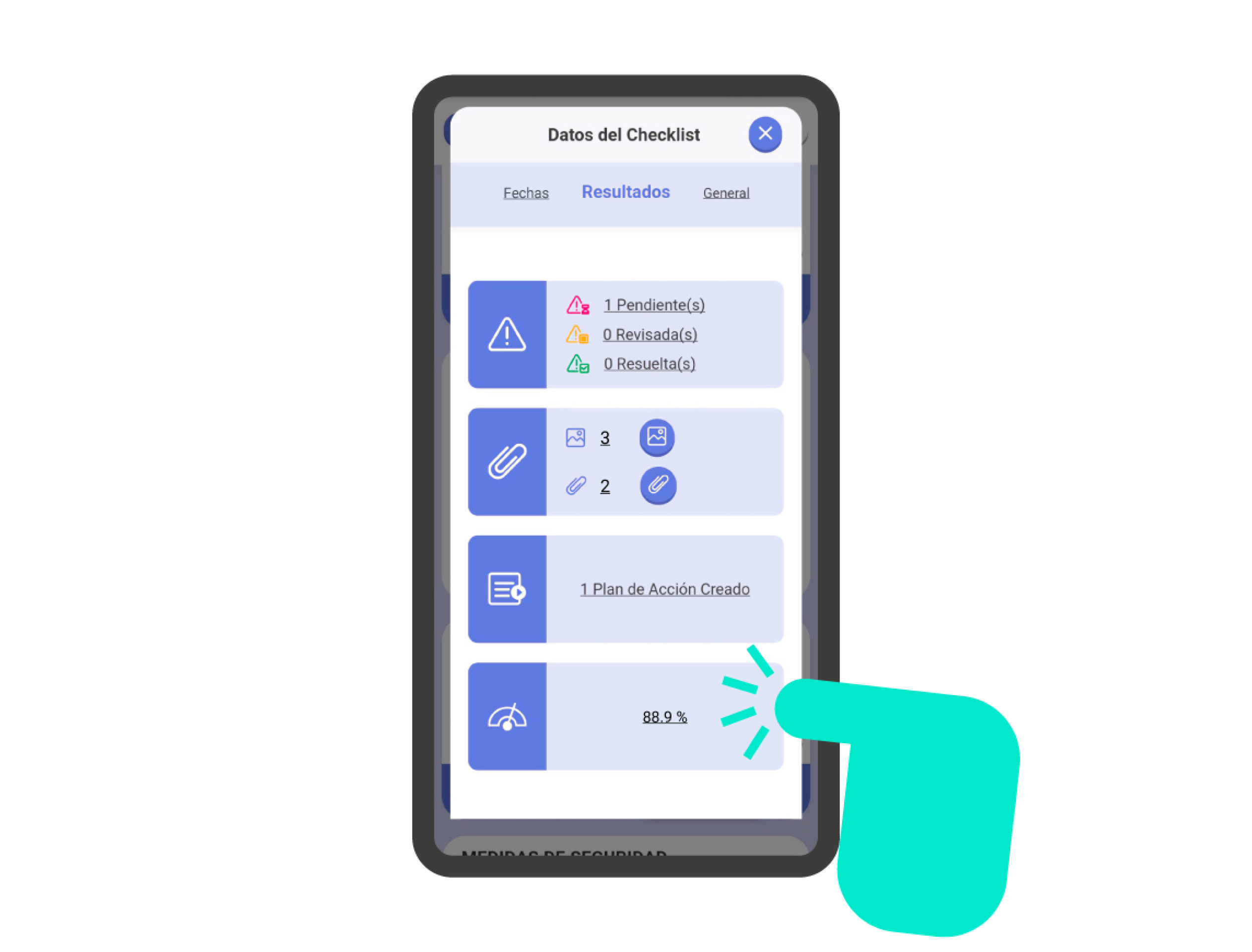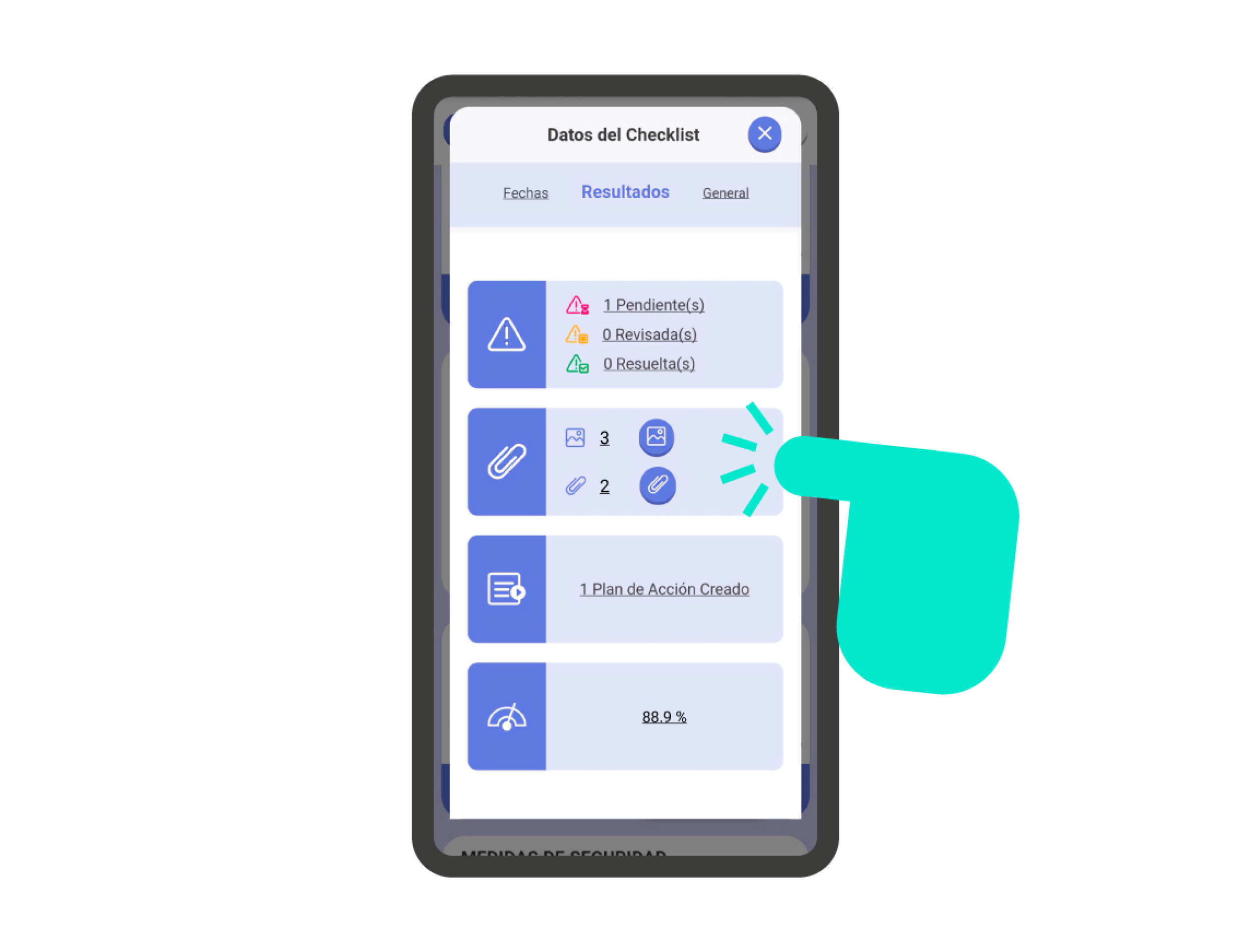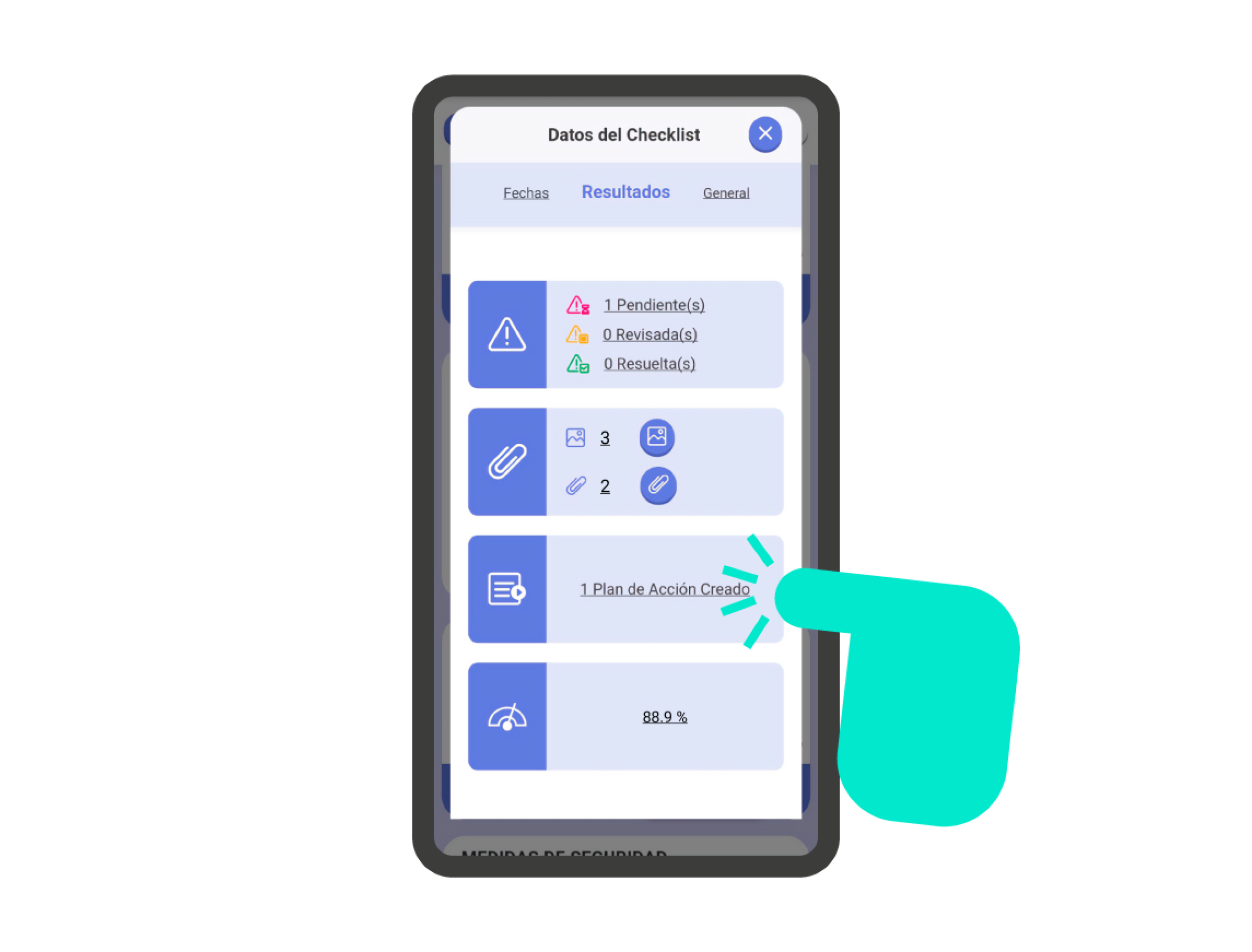 En la sección ‘Resultados’, dentro de la pantalla de información de la checklist, encontrarás la parte de Planes de Acción. Indica el número de planes de acción creados en la checklist. Si haces clic en la sección, podrás gestionar los planes de acción creados.