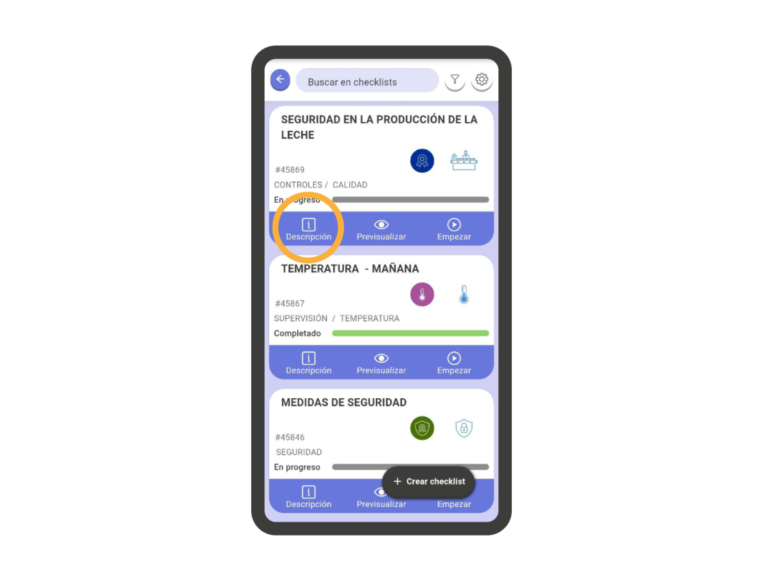 Todas las checklists cuentan con un apartado de consulta de información general. Para acceder, haz clic en el icono ‘Descripción’ en la tarjeta de cada checklist. Aquí, tendrás acceso a diferentes apartados temáticos, donde podrás consultar: