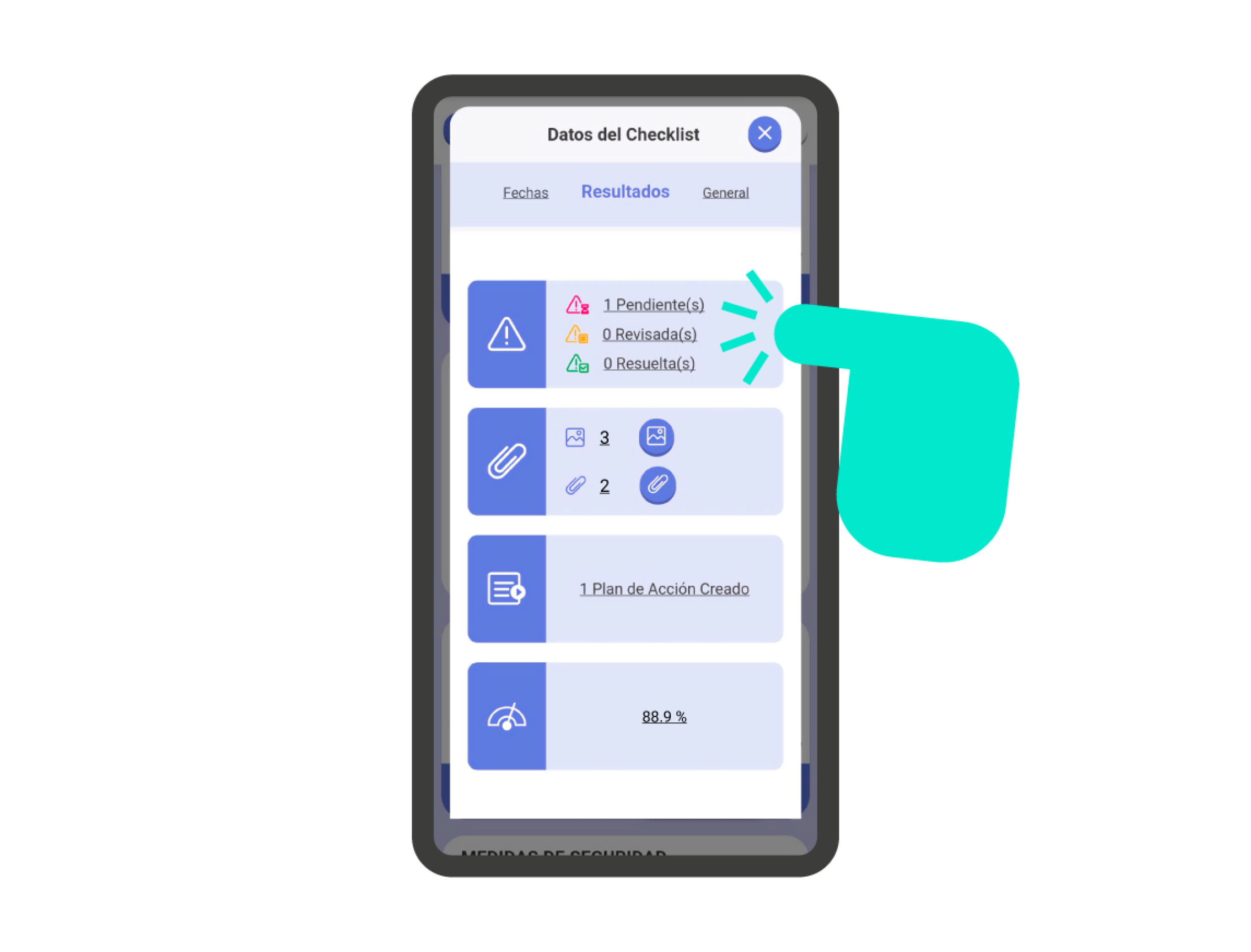 En la sección ‘Resultados’, dentro de la pantalla de información de la checklist, encontrarás el apartado de Incidencias. Es un resumen del estado de las incidencias de la checklist, si las hay. Si haces clic en la sección, podrás gestionar el estado de las incidencias (ver punto Gestionando los estados de las incidencias).