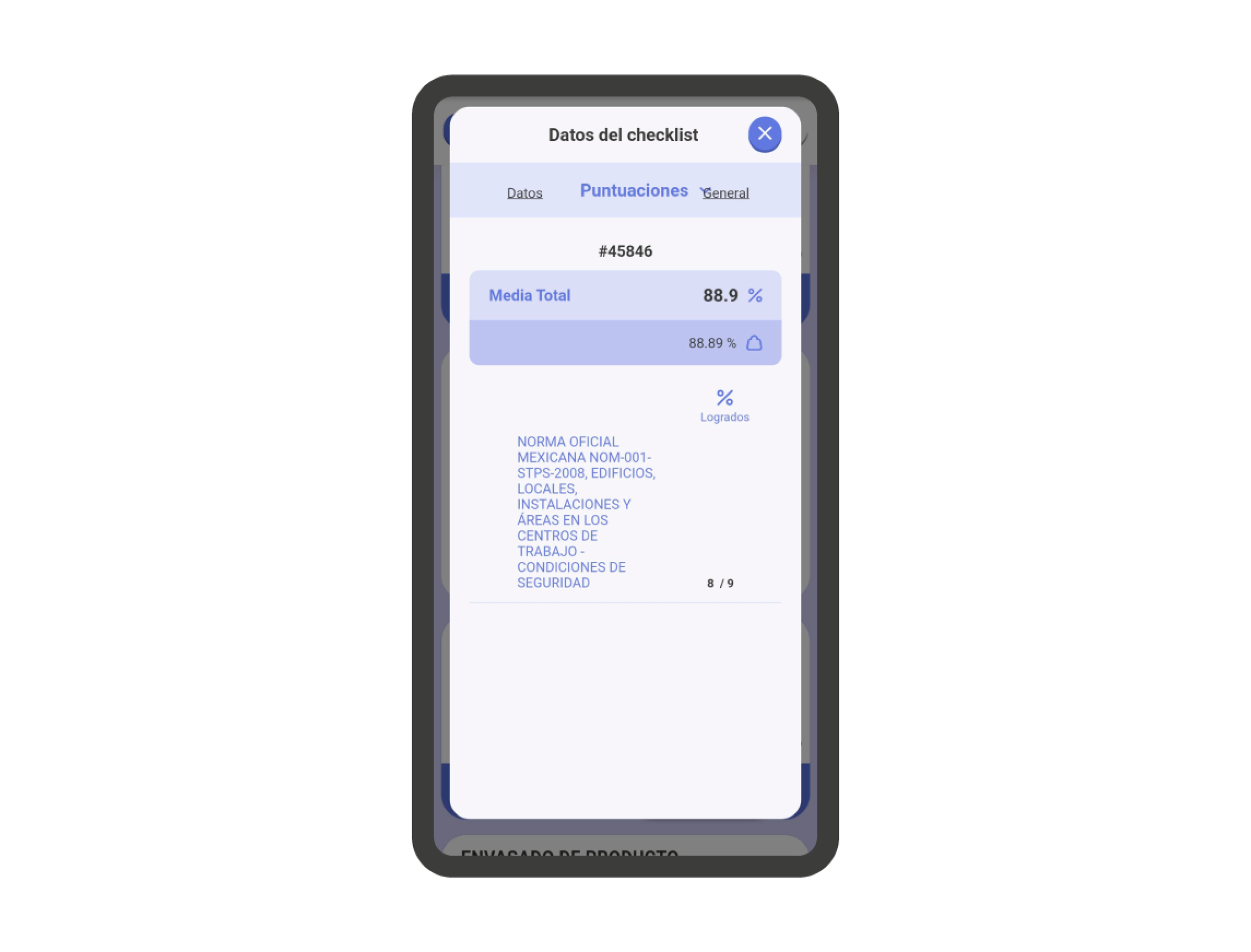 Dentro de la sección ‘Resultados’, en la pantalla de información de la lista de verificación, encontrarás el apartado de Puntuación. Es un indicador de la puntuación actual de la lista de verificación, si se ha definido en la plantilla. Si pulsas en la sección, podrás ver en detalle la puntuación obtenida.