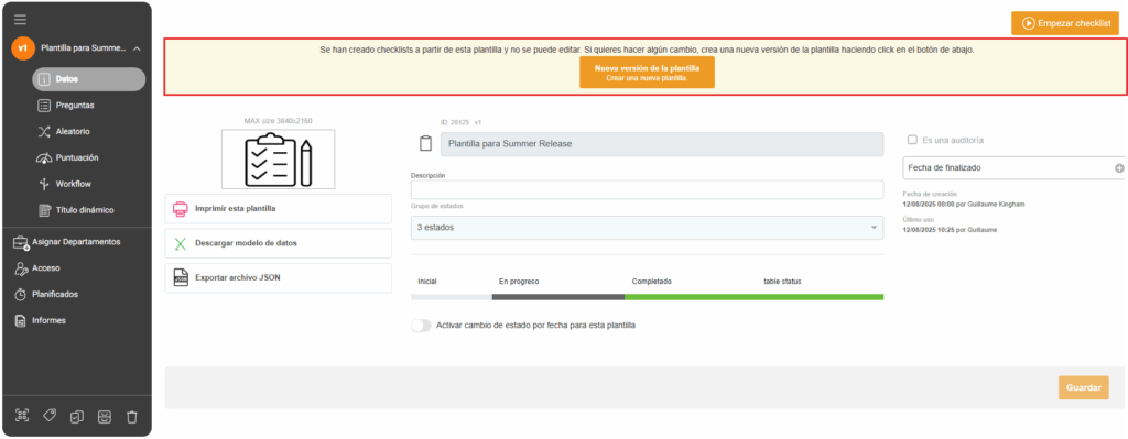 • Nota importante: Una nueva versión de plantilla solo se puede volver a poner como borrador si no se han creado checklists a partir de ella todavía. Una vez que se crea una checklist, esta versión se vuelve permanente.