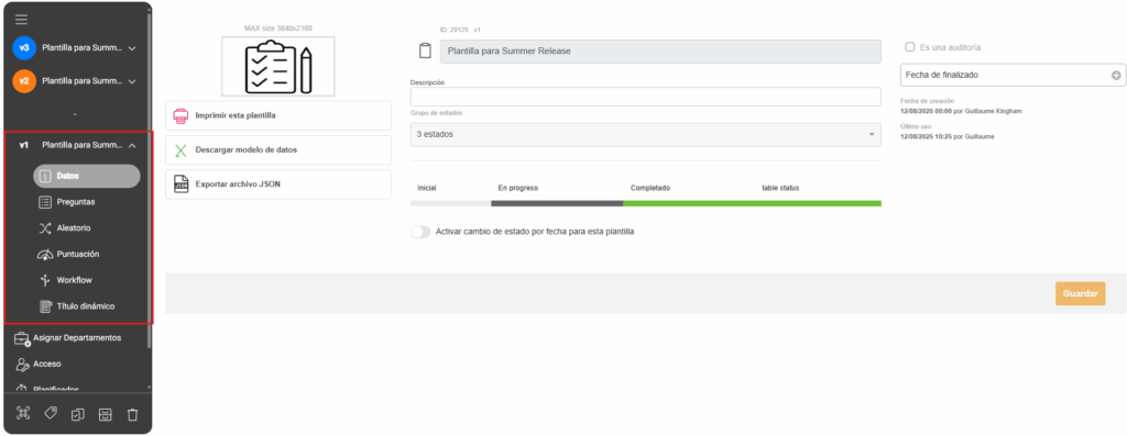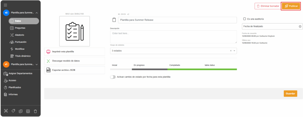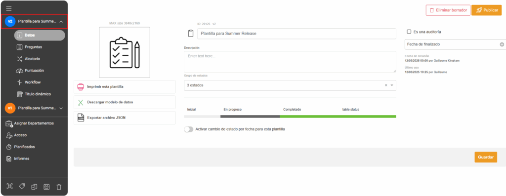 El versionado de plantillas le permite realizar cambios en una plantilla sin afectar a las checklists ya creadas. Esto se gestiona a través de dos estados: un borrador y una versión publicada.