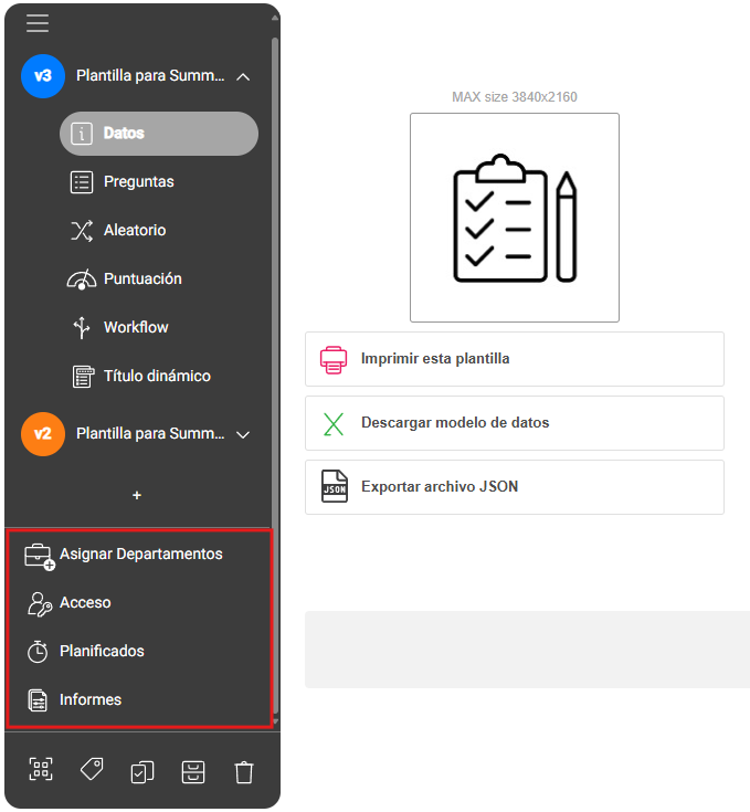 • Menú lateral del editor de plantillas: El editor de plantillas ahora cuenta con un menú lateral reorganizado. Está diseñado para ser más limpio y eficiente al agrupar configuraciones relacionadas e introducir un menú expandible para admitir múltiples versiones de plantillas.