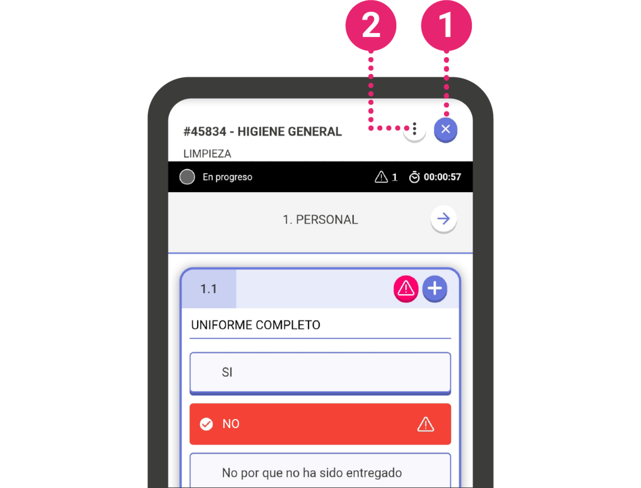 Para cerrar una checklist, pulsa el botón con el símbolo ‘X’ (1). También puedes cerrar la checklist desde el menú de opciones de la checklist (2). En este menú puedes seleccionar cualquiera de las tres opciones que aparecen en la parte inferior del menú para ir a una pantalla concreta tras cerrar la checklist (Ir a PREVISUALIZACIÓN, a la LISTA DE CHECKLISTS o a la pantalla INICIO).