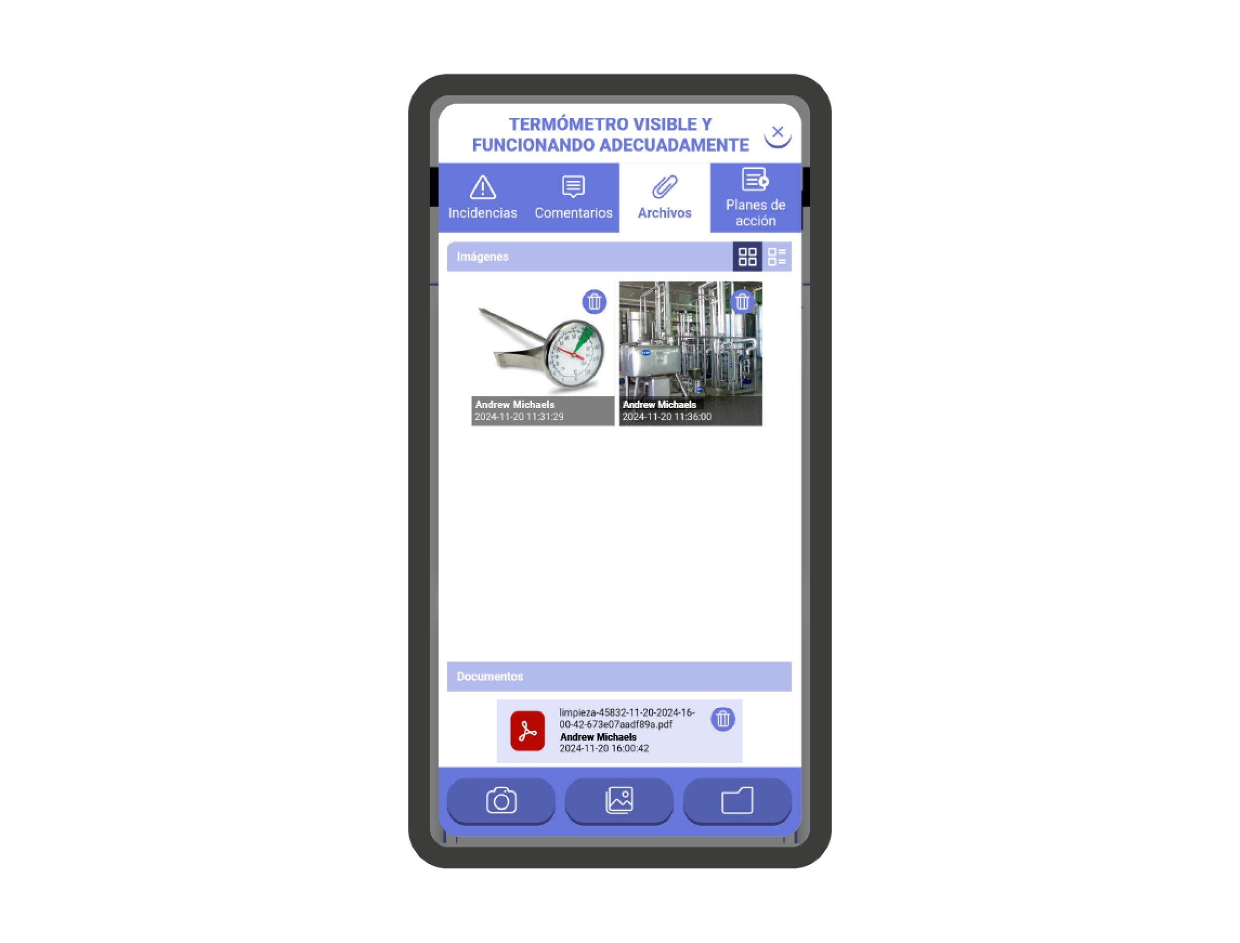 • Fotografías y archivos: Puedes hacer una o más fotografías con la cámara o incluirlas desde el dispositivo, quedando registradas en una galería exclusiva de la pregunta. También puedes subir cualquier archivo (no es recomendable subir archivos de más de 100mb) como pdf, doc, zip, etc. Los archivos también quedarán registrados en la galería exclusiva de la pregunta.
