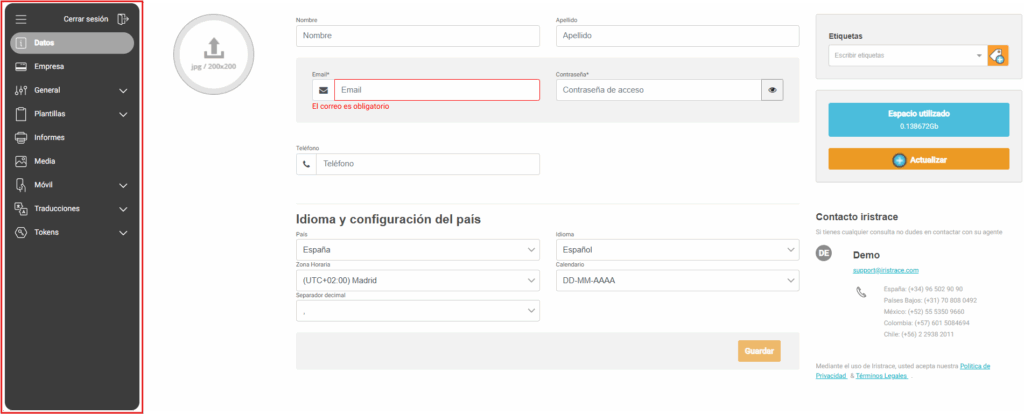 El menú de configuraciones se ha rediseñado por completo y ahora es una barra lateral moderna y plegable. Este nuevo menú organiza todas las configuraciones en categorías lógicas como Datos, Empresa, Plantillas y Móvil.