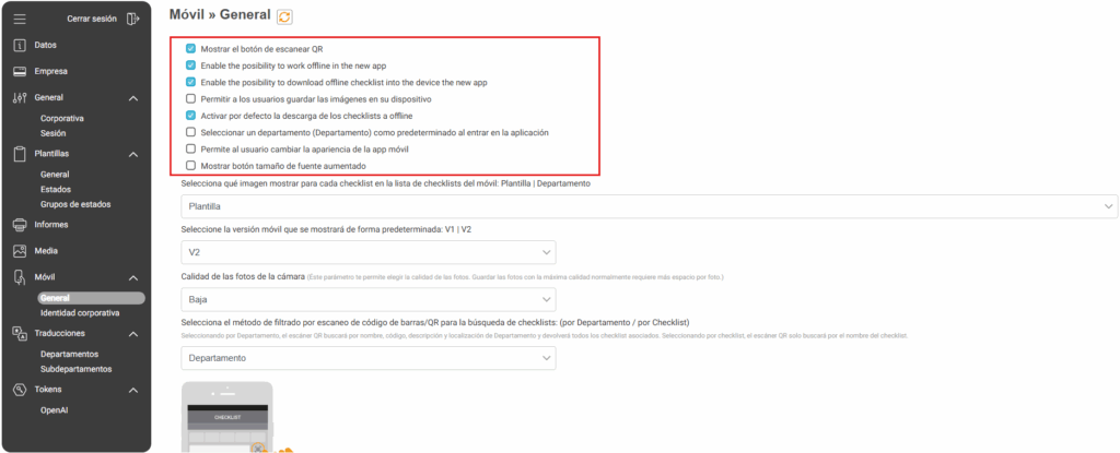 Se ha añadido una nueva sección de Móvil al menú de configuraciones. Dentro de Móvil > General, encontrará las configuraciones clave que afectan al funcionamiento de la aplicación móvil.