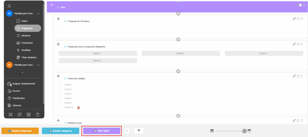 Ahora puede añadir una tabla directamente a su plantilla. Las tablas funcionan como un nuevo tipo de categoría, en el que cada pregunta que añada se convierte en una columna. Esto le permite crear una entrada de datos estructurada y repetible para sus checklists.