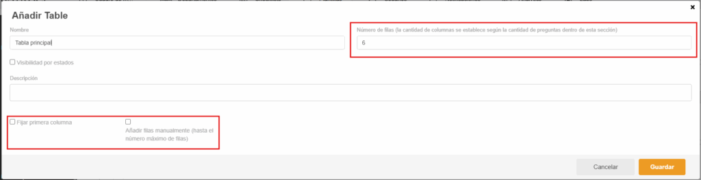 - Filas: Puede establecer el número máximo de filas que puede tener una tabla. También puede decidir si las filas están todas disponibles por defecto o si el usuario debe añadirlas manualmente (hasta el recuento máximo).