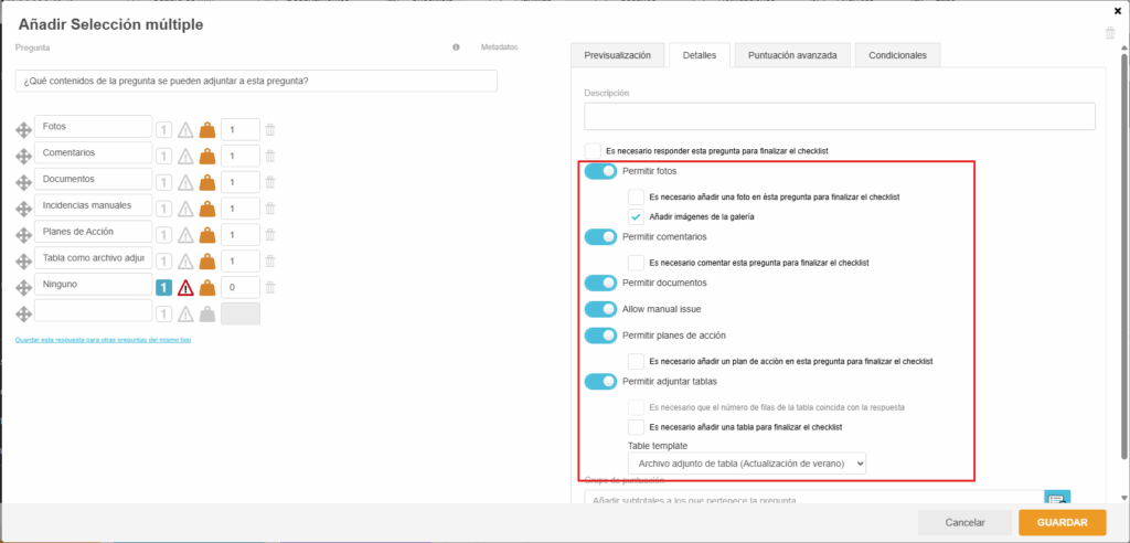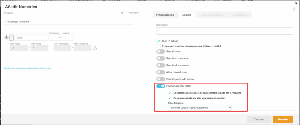 - Conectar a una pregunta: Al configurar una pregunta (como un tipo Numérico u Opción única), puede habilitar la opción Permitir adjuntar tablas y luego seleccionar qué plantilla de Tabla como adjunto desea vincular a ella.