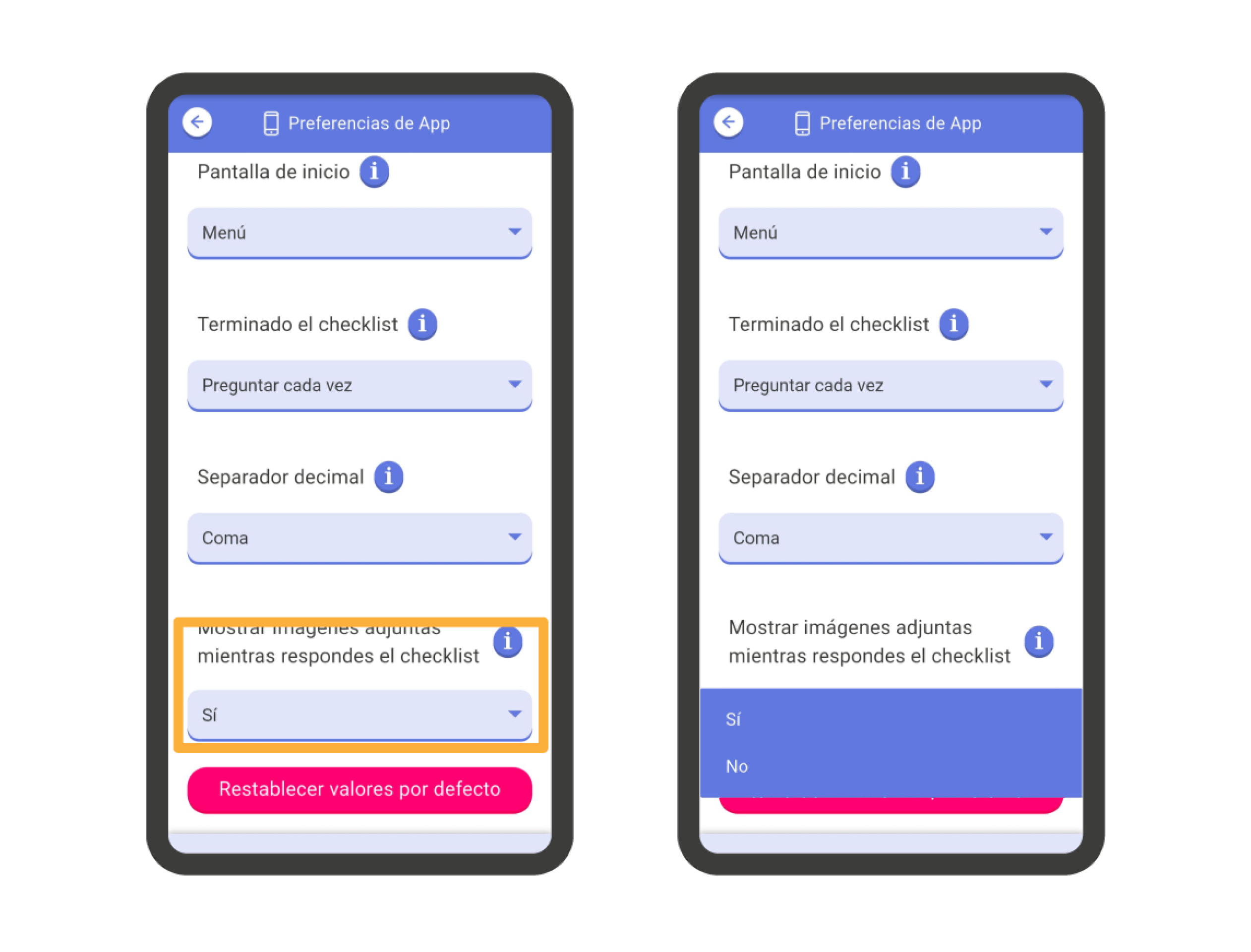 Para ello, debes dirigirte al menú principal de la aplicación, y desde allí, ir a la sección ‘Preferencias de la App’. Aquí encontrarás un desplegable con el título ‘Mostrar imágenes adjuntas mientras respondes la checklist’. Selecciona la opción que mejor se adapte a tu flujo de trabajo.