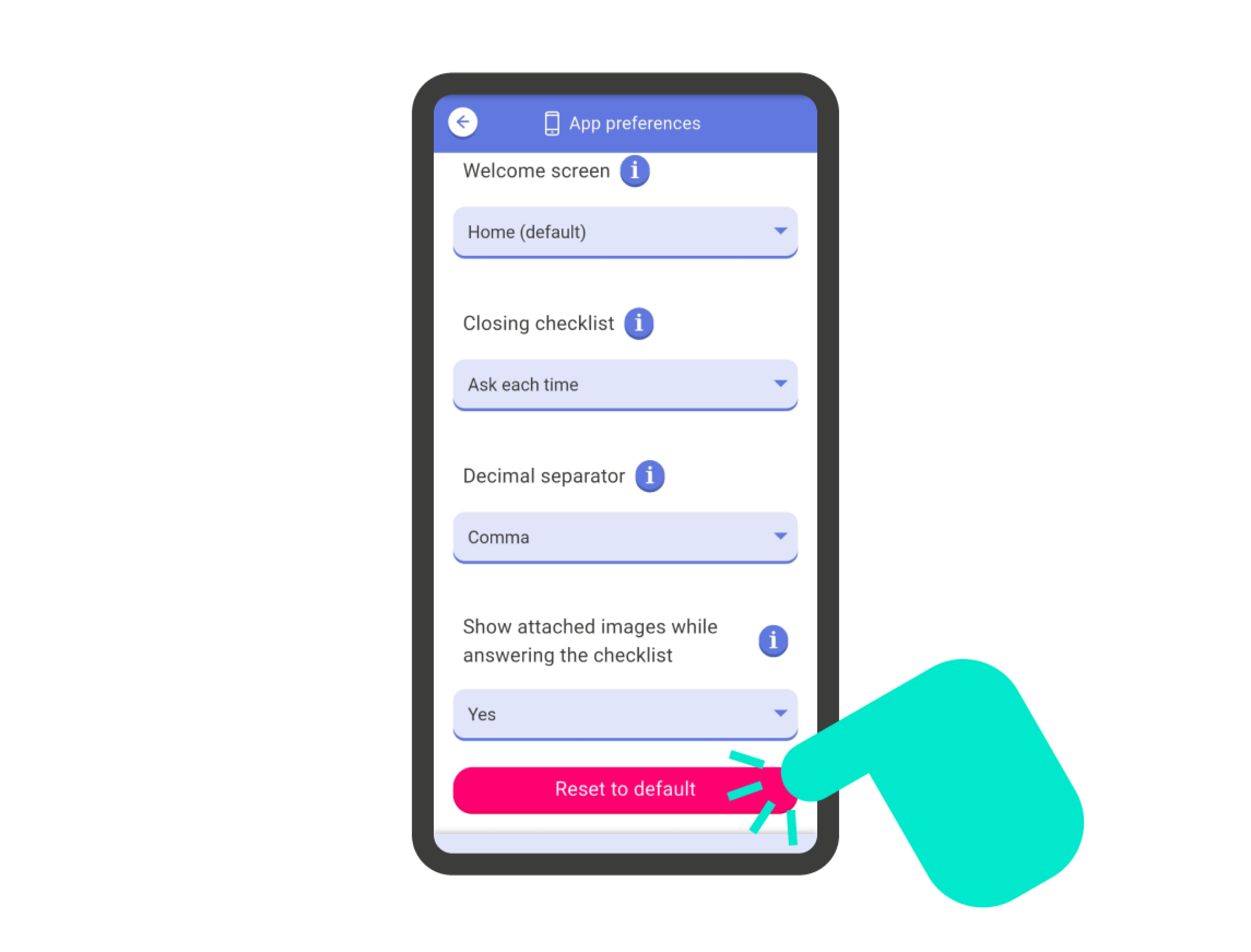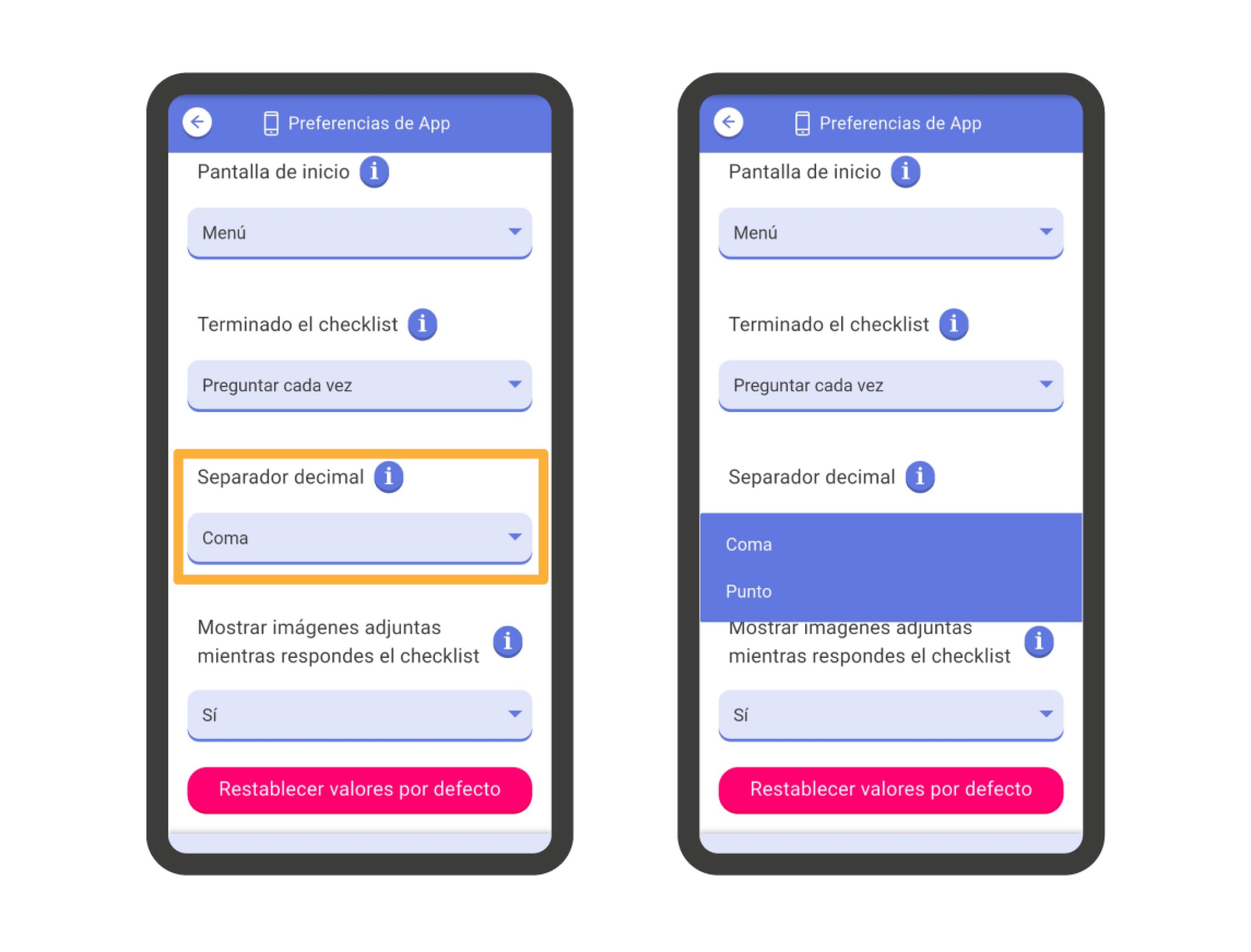 ¡Importante! Los valores que se restablecen son los que competen a los mostrados en esta página (Pantalla de bienvenida, Terminada la lista de control, Separador decimal, Mostrar imágenes). El resto de las configuraciones de la aplicación no se verán alteradas.