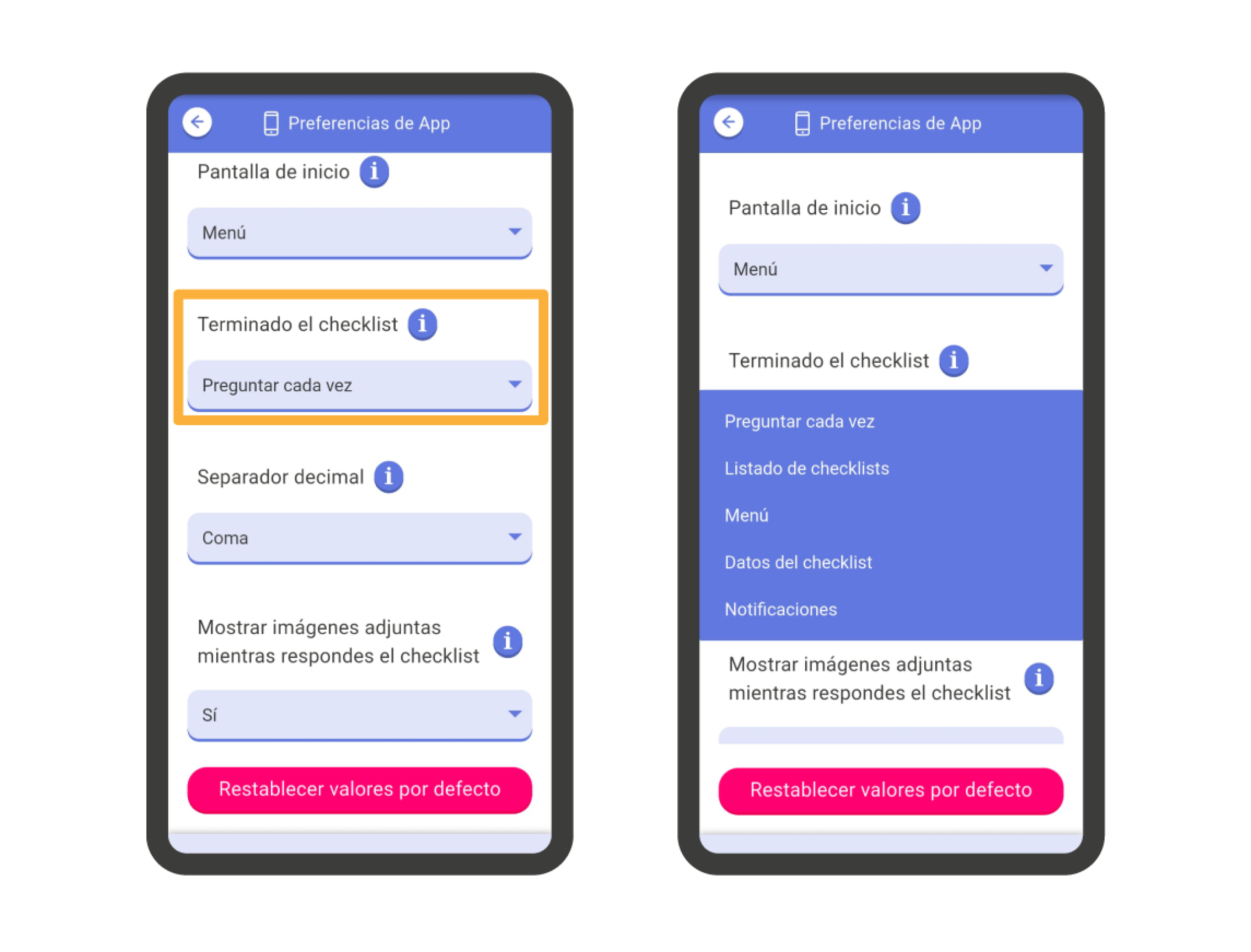 Para ello dirígete al menú principal de la aplicación, y desde allí, ve a la sección ‘Preferencias de la App’. Aquí encontrarás un desplegable con el título ‘Terminada la checklist’.