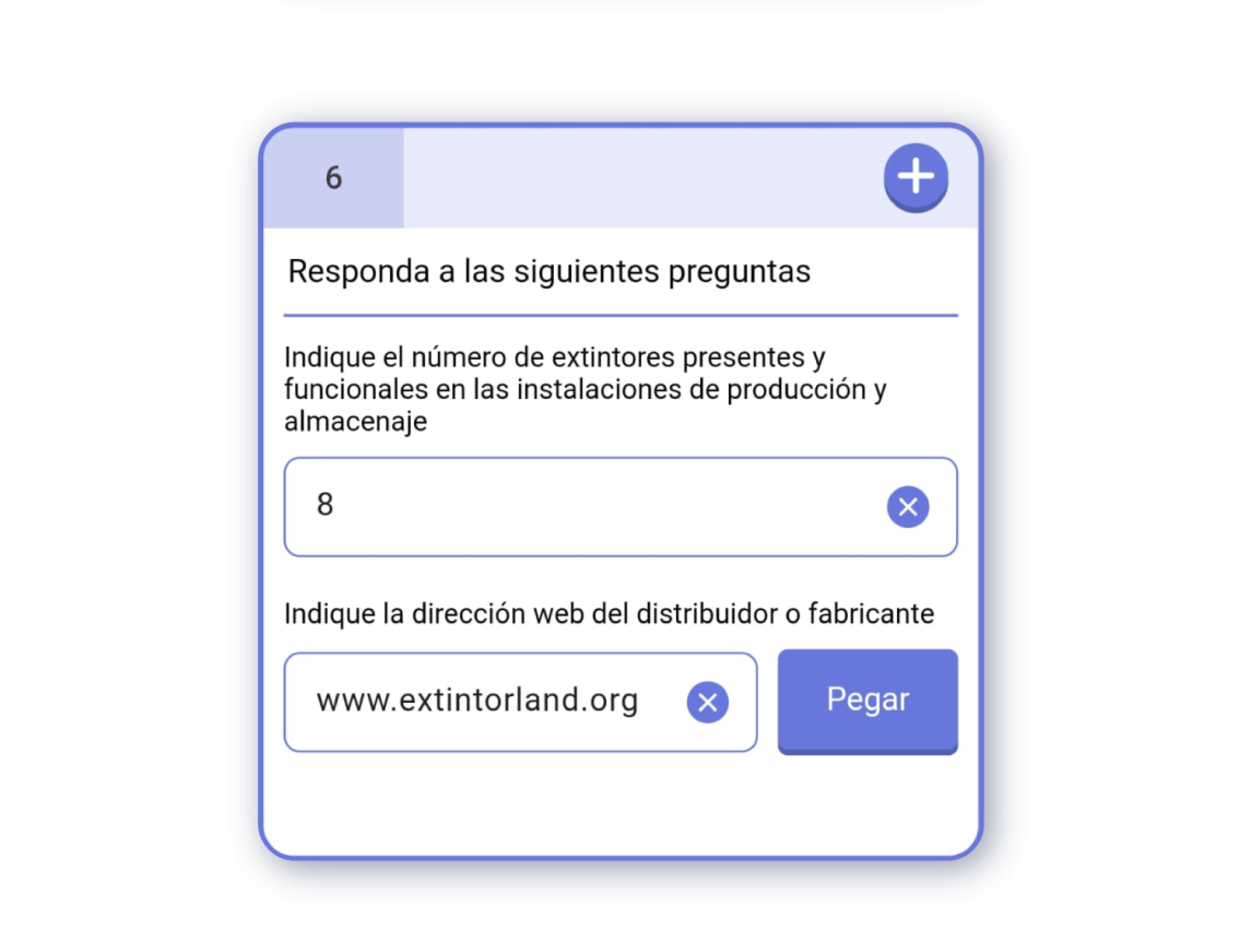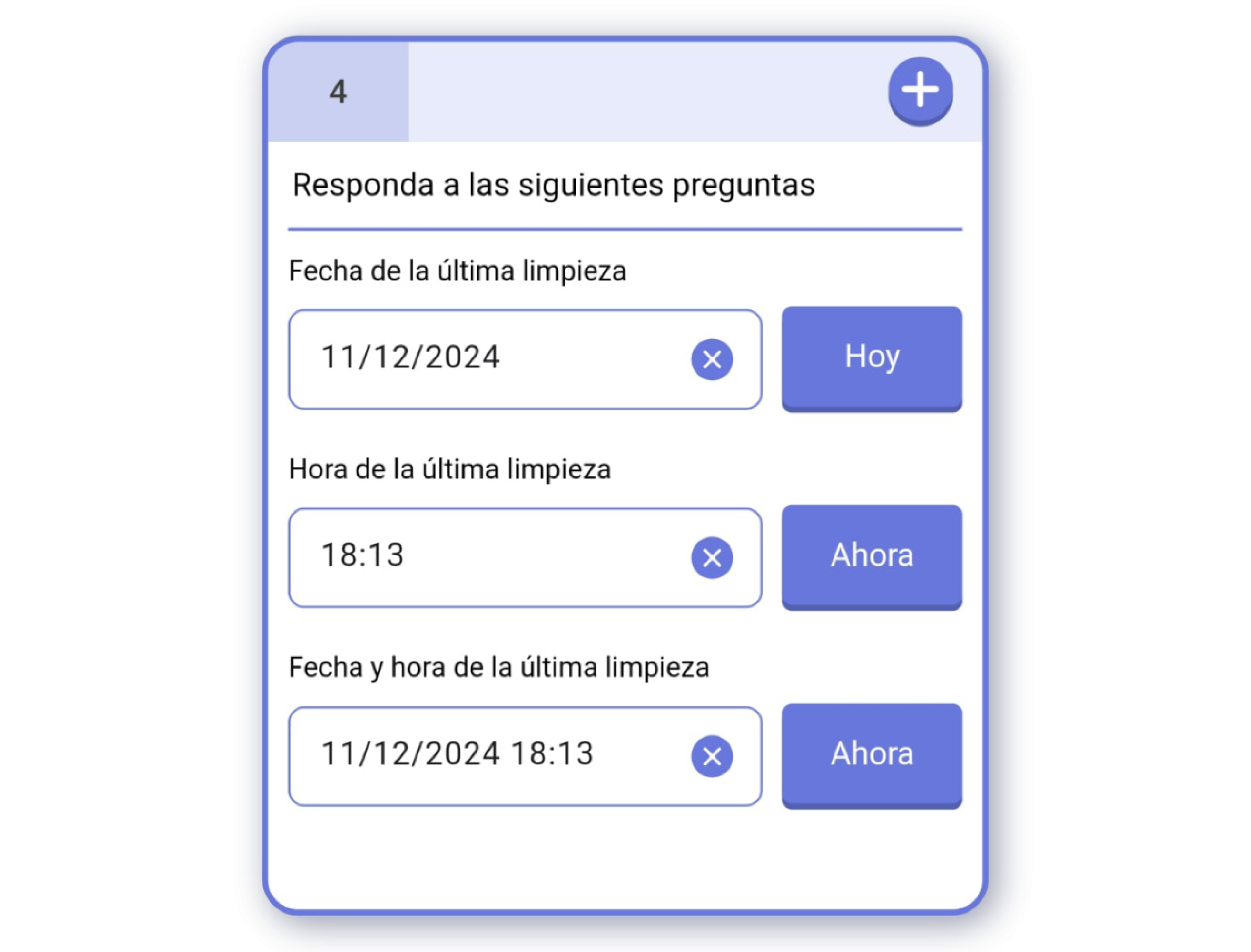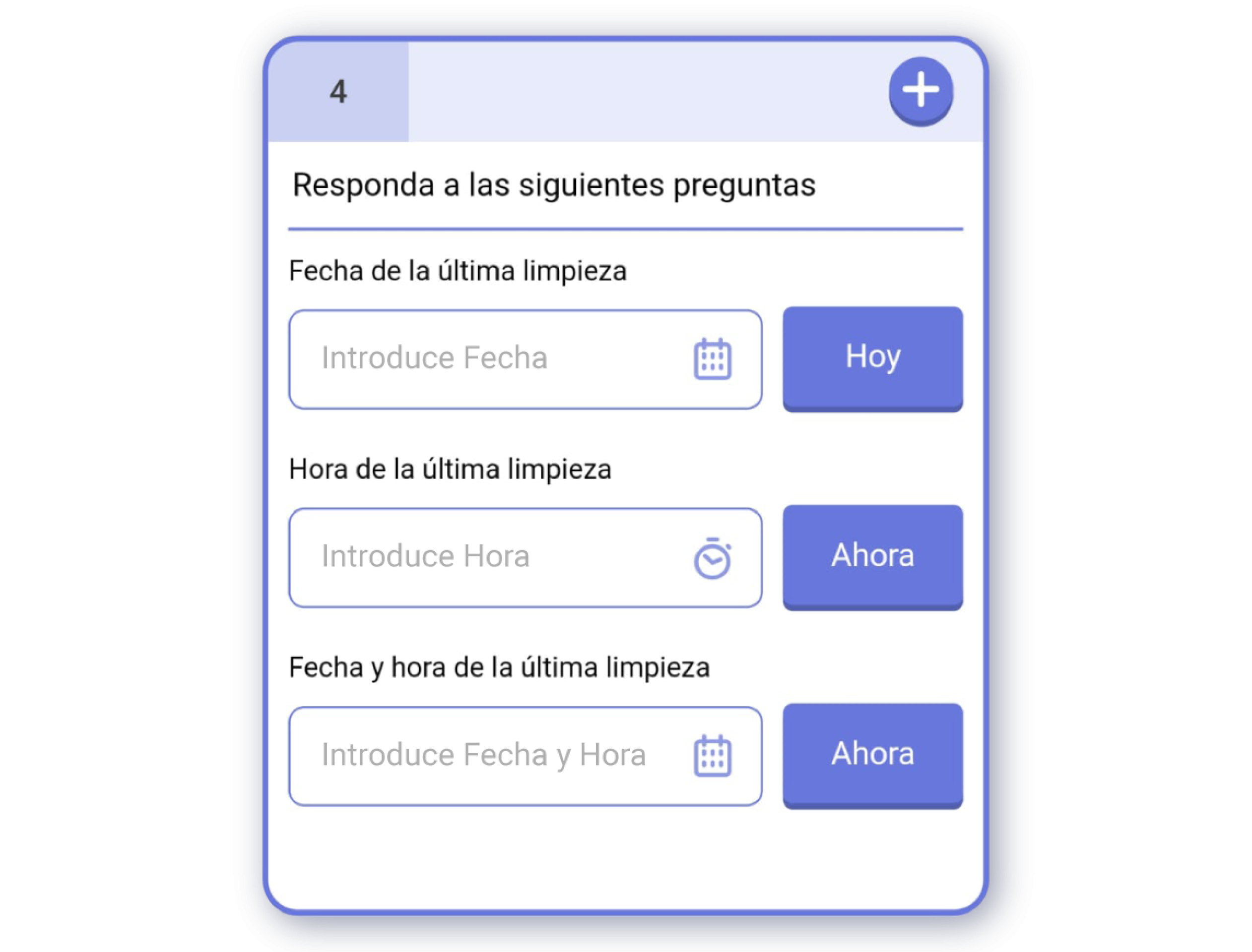 ¡Importante! Puedes escanear un código de barras con un icono al lado de la caja de texto. Al escanear el código, se introducirá el número del código de barras como respuesta.Fecha: Respuesta de fecha seleccionable desde un calendario.Hora: Respuesta de hora y minutos seleccionables desde un reloj.Fecha y Hora: Respuesta que combina los dos anteriores modos en una sola respuesta.Ubicación: Respuesta que registra la localización del usuario. Puedes utilizar la geolocalización del dispositivo para registrar la respuesta.Número: Respuesta que registra un número.URL: Respuesta que registra una dirección web.